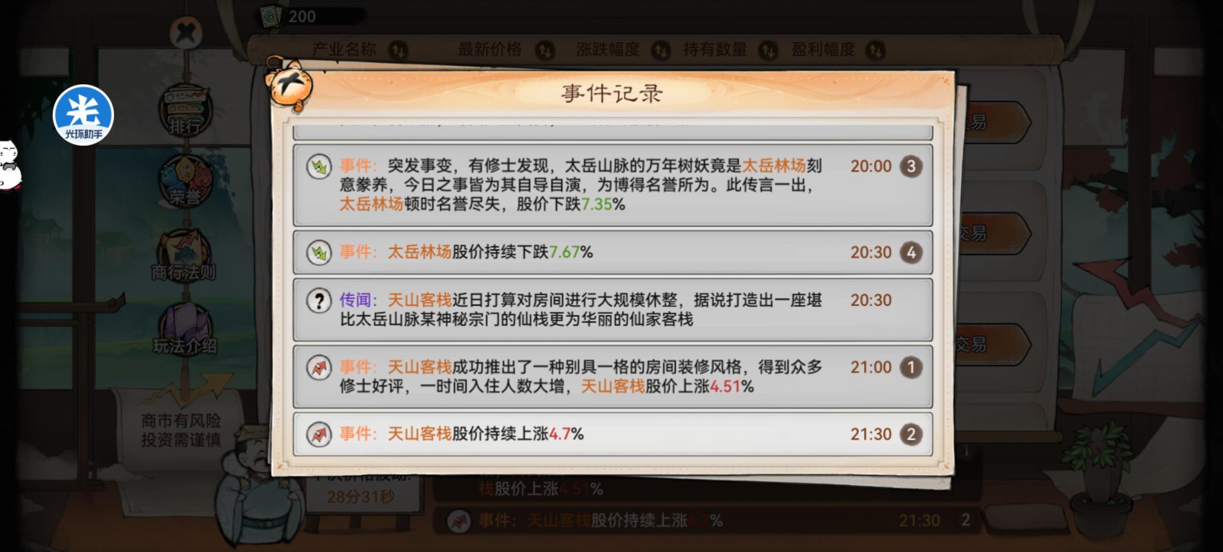 上周也是大意失股神,这周也是重新拿回了股神中间的事件签基本吃到了,有一个模棱两可的事件签也是靠股神推荐吃到了,股神推荐是指上一个周期波动股神所买的股,目前还没试过分开买,大部分人应该也不会分开买吧天云良田这家伙,但凡有它的事件,第一反应就是赶快跑,跌到爆太岳酒肆的事件,我只能说哥们,你这跟没有有什么区别天山客栈的事件买了跌亏不了多少,涨可以小赚一笔,还行