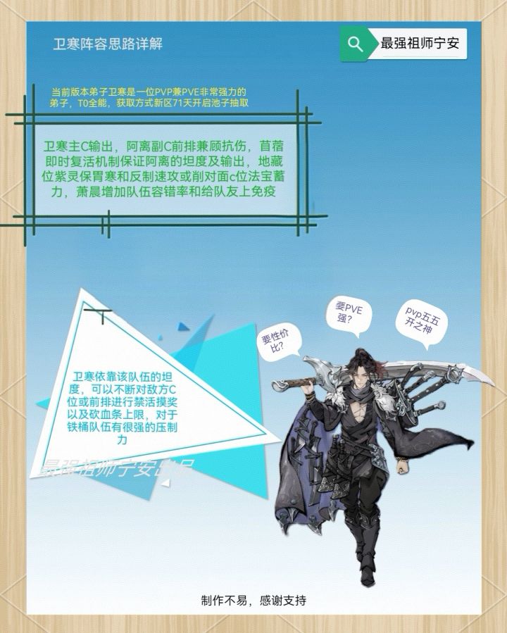#游戏攻略 经常有人说,upup,我想主打PVP竞技,是不是就不能玩好PVE了?非也,这两者并不冲突。 关注宁安不迷路,宁安带你玩转祖师 (上图为up主打pvp的一个账号)那么废话不多说,蛊队干货教学开始需准备如下:阿离、天火蛊(零氪不拉天火)、五行煞气蛊(煞气入体怪癖),3五行辅助蛊(其中一个备用不着急拉)、唐蝶衣 △注:先全红命再给输出蛊补仙三,练度只拉输出蛊,辅助蛊坦度保证不死即可