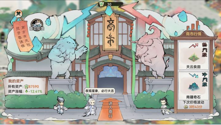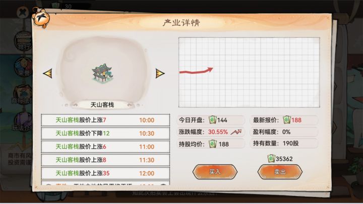 这次新出的股市活动大大提高了游戏的趣味性,而关于股票的购入也经常是“低买高卖”。比如第二张图中的天山客栈在持续的下跌后已经有明显的上升趋势了,这时购入股票是比较好的选择。(股价是每半个小时更新一次)在多次更新后可以看到天山客栈的股价在12:00的时候上升的最多,这个时候就可以选择卖出股票,达到利益最大化,不然就会像后面一样,股价突然大跌,由盈利变为亏损了。如果想要稳定获得股票,可以选择像第四