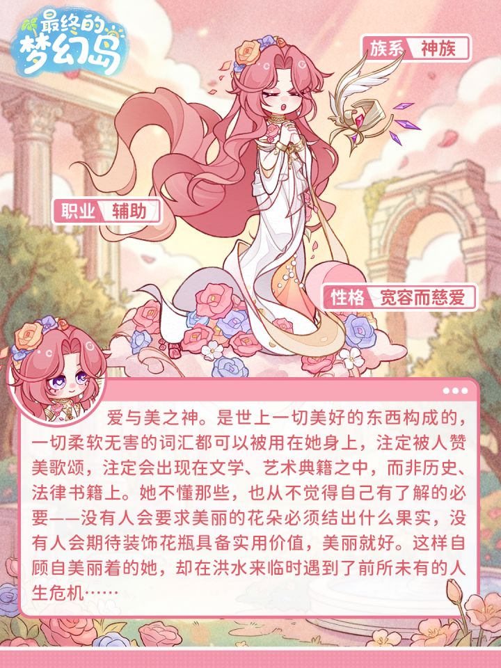 岛主大人~海盗们又又又来了,别担心,时空之门的伙伴来保护我们啦!(◕ᗜ◕)✧ ———————————————————✨ 新伙伴情报解锁:【维纳斯】 ✨哇——(深吸一口气)空气里突然充满了玫瑰花的香气!这位新伙伴可是大有来头哦!她是爱与美之神——维纳斯!📋 布洛的小本本记录:🌸 身份:神族 / 爱与美之神🛡 职业:辅助💖 性格:宽容而慈爱💭 关于她的故事:她是一切美好事物的化身,