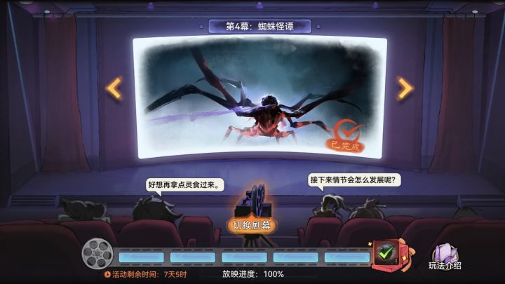 第4幕:蜘蛛怪谭 至尊宝:虽然明刀明枪斗不过她,但暗箭她就难防了,所以我们决定晚上用五毒迷魂香给这个女魔头尝尝。韩飞羽:这真的有用吗?至尊宝:哼,这个五毒迷魂香可是我们的镇帮之宝,就连神仙都可以迷倒啊!杨安:吹牛的吧。西门宇:绝对是吹牛的。至尊宝:喂,你们不要这么不给面子啊!真的很管用,只是后来不知哪里冒出来一只大蜘蛛,把局面给搅混了。韩飞羽:你说的那只大蜘蛛,长得像这样吗?蜘蛛精