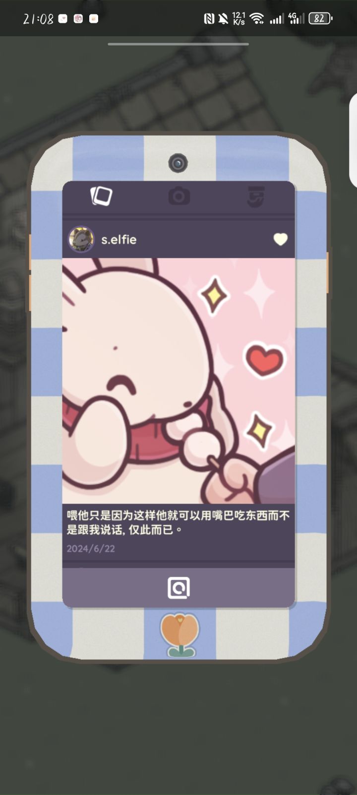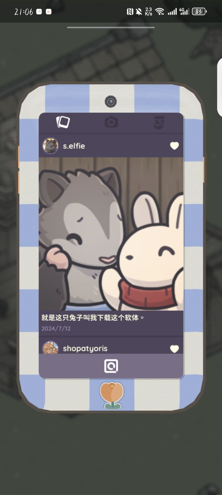 刚才我点对话框 她扭扭捏捏的说实在是太无聊了 然后又吞吞吐吐的问月兔有没有多余的钓鱼竿 月兔说没有然后我现在点对话框她就不好意思说话了啊啊啊特别特别可爱!!!#游戏讨论#月兔漫游#月兔漫游艾菲