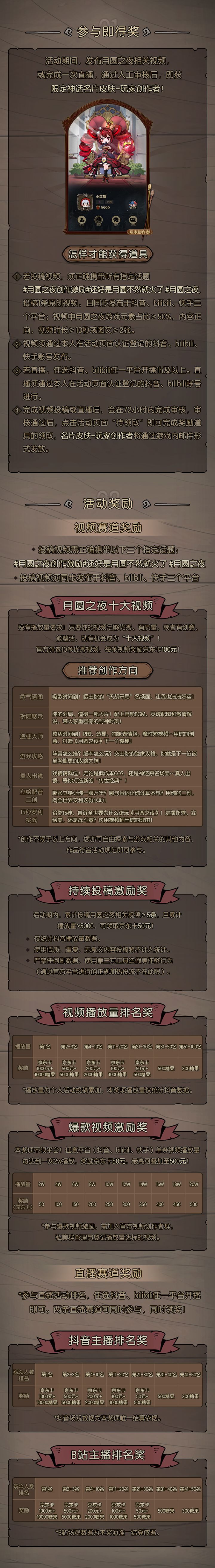 ✨月圆之夜创作者激励计划正式开启,参与即得限定神话名片皮肤!📹 视频赛道:投稿优质内容,冲刺 “十大视频” 赢 100 元京东卡,累计投稿还能拿持续激励奖!🟢 直播赛道:开播满 1 小时即可参与,人气排名奖池丰厚!更有播放量阶梯奖励,多投多得,福利拉满!✅ 创作自由:欧气晒图、整活造梗、攻略解说全都行!活动页面:详细规则见图,快带上话题参与吧!#月圆之夜创作者激励 #月圆之夜 #还好是