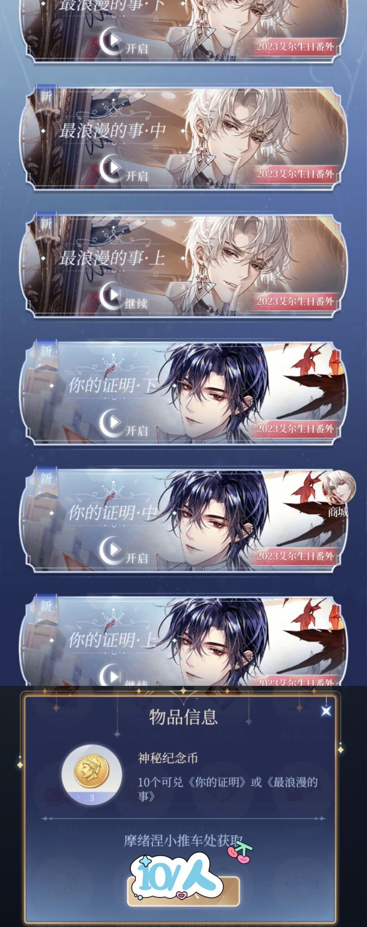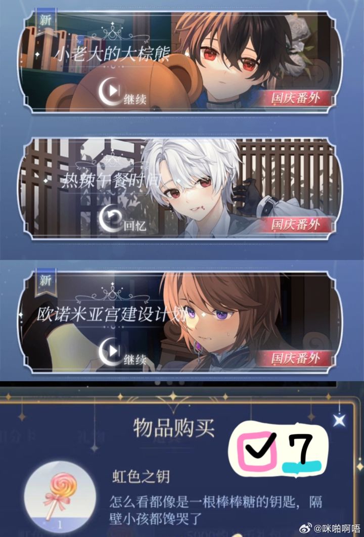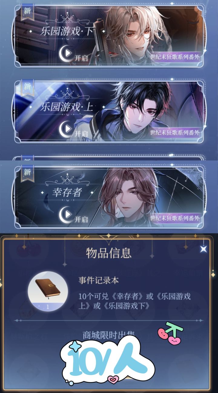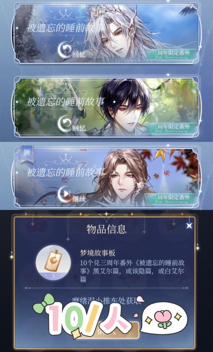 已更新【图片版】! 剩下的见评论区【三周年】限定番外需消耗(梦境故事板)道具进行兑换单人10个解锁,全部解锁需30个黑白该/《被遗忘的睡前故事》【春酒倾欢歌】番外需消耗[相思红纸]进行兑换单人7个解锁,全部解锁需21个黑《旧岁除》该隐《意相牵》白艾尔《新岁欢》 【世纪末狂歌】系列番外事件记录本兑换单人7个解锁,全部解锁需21个白《乐园游戏·上》黑《乐园游戏·下》