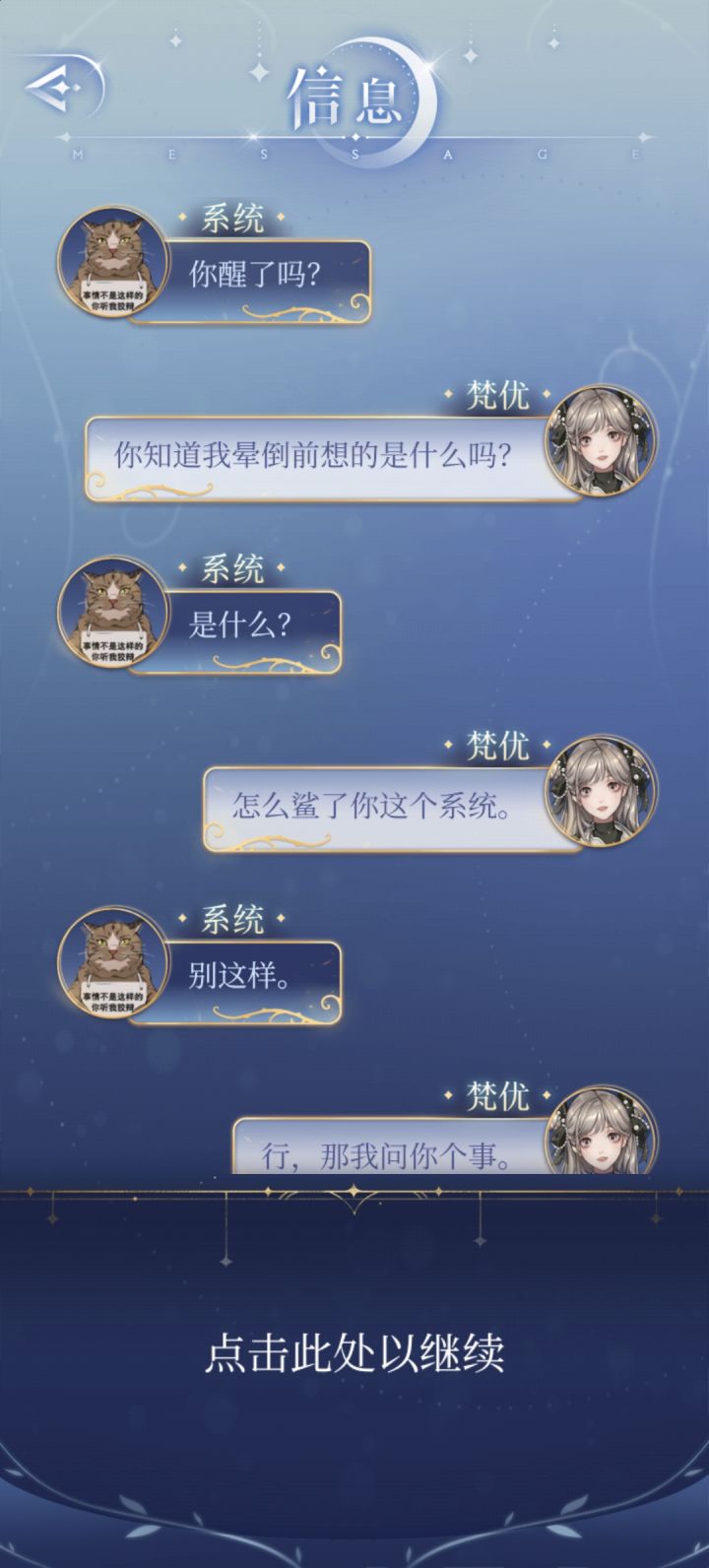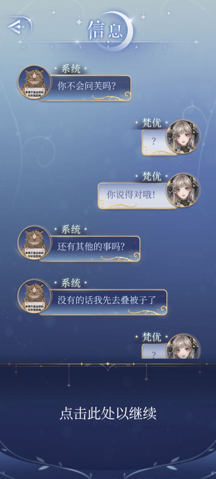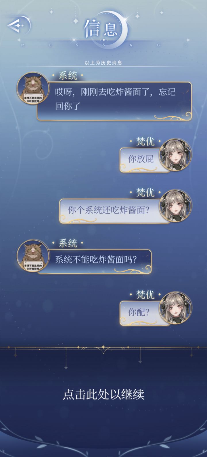 梵优经常调侃系统,比如称呼它为“破猫”、“骗子猫”,甚至质疑它作为系统的合法性(“你只是一个系统好吗?”)。系统则以幽默和略带吐槽的方式回应,比如自称“可爱的小猫咪”,或者用哲学系毕业的背景来回击梵优的质疑。这种互相调侃的模式是他们互动的主要形式,充满了轻松和幽默。----------------------------------------------------对于系统=梵优这种关