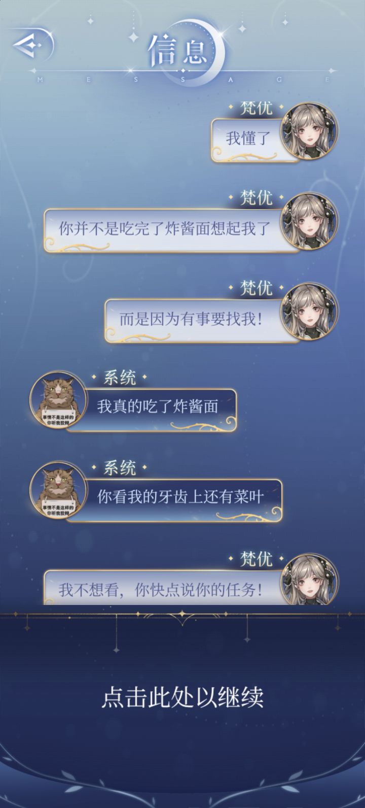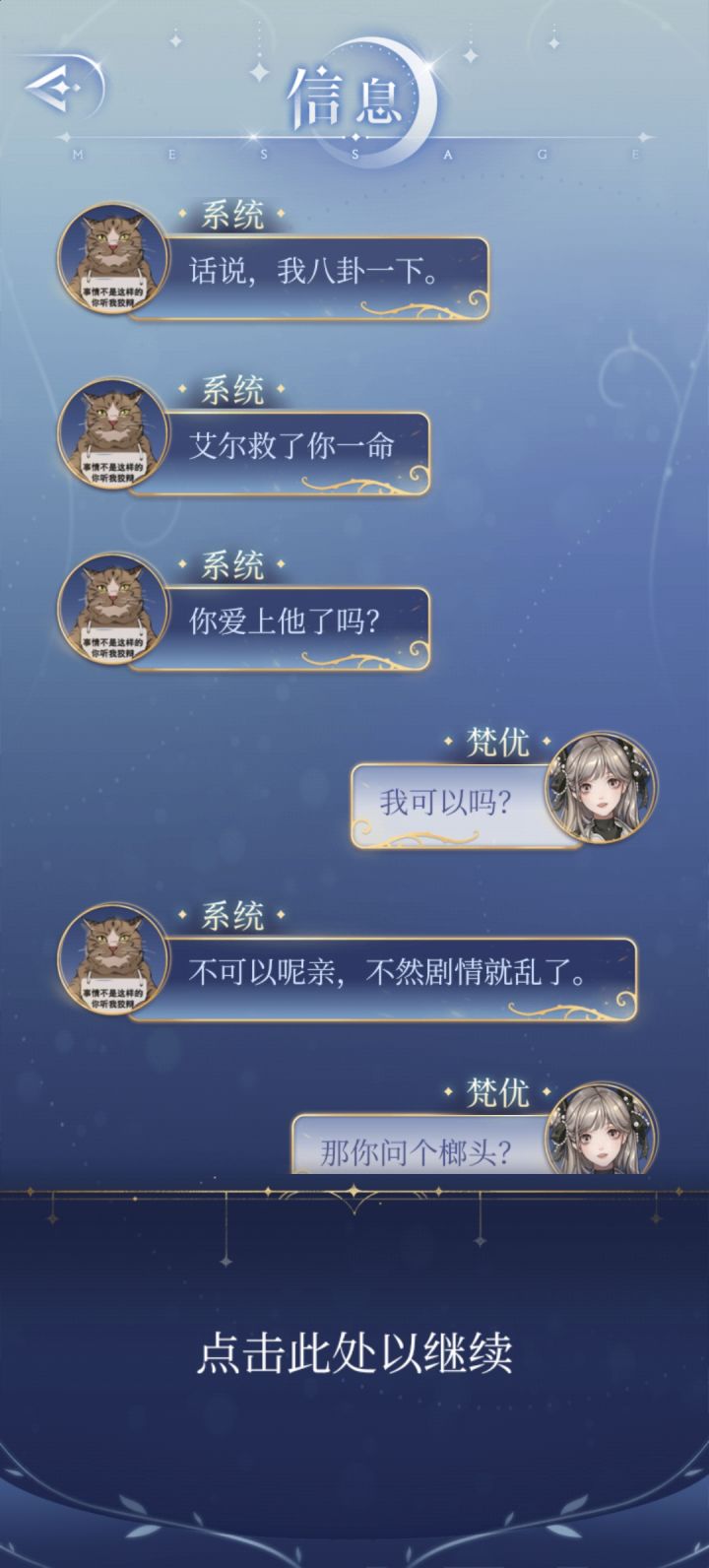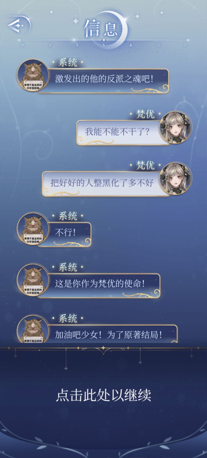 梵优经常调侃系统,比如称呼它为“破猫”、“骗子猫”,甚至质疑它作为系统的合法性(“你只是一个系统好吗?”)。系统则以幽默和略带吐槽的方式回应,比如自称“可爱的小猫咪”,或者用哲学系毕业的背景来回击梵优的质疑。这种互相调侃的模式是他们互动的主要形式,充满了轻松和幽默。----------------------------------------------------对于系统=梵优这种关