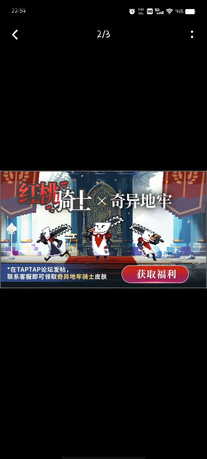 [图片] 红桃骑士,激情碰撞,勇者无敌! 快来评论区回复发帖截图,领取你的“奇异地牢骑士”皮肤吧 【活动时间】活动时间:5月22日 10:00-6月19日 【参与方式】在taptap社区发帖,将发帖截图评论至帖子下方,还可以参与京东卡和海量道具的抽奖哦~ 【活动奖品】50元京东卡*3 【兑换方式】* 无限深渊官方13群727276338* 【无限深渊-官方15群】865233057 开奖