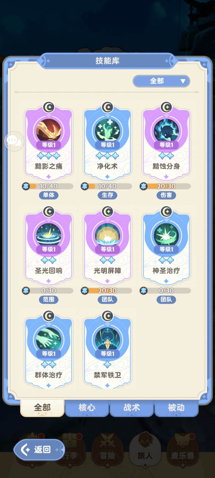 Lv18副本恢复、群体治疗、屏障「蓄力重拳」屏障Lv23副本恢复、群体治疗、屏障「终极毁灭」屏障Lv30副本恢复、群体治疗、屏障「金币雨」屏障Lv45副本恢复、群体治疗、屏障「深渊重压」屏障Lv65副本恢复、净化、神圣治疗「传染」净化,第二命时「暴力砸地」神圣治疗一转——————————————Lv80副本恢复、净化、屏障「小怪读条结束之前」屏障Lv20副本恢