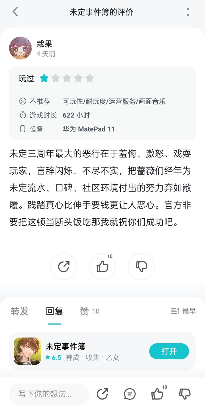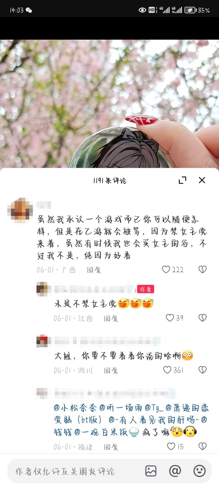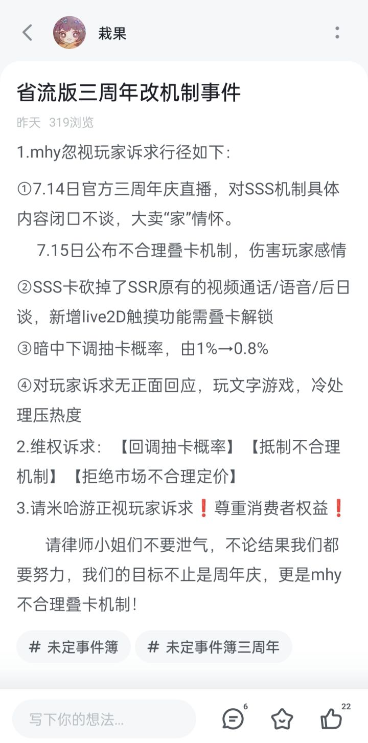 首先我是已经退游了,真的已经找不到任何玩这款游戏的热情了。结果在抖音上刷到因为出了新卡,这一次没画崩,然后又一群人要回游的,说着不能因为自己犯贱然后就抛弃免费邀请函。哈哈,我选择尊重吧。只是这场看不到头的维权到底要多久呢,最后维权的我们是不是已经成了笑话,现在连抖音都在女主党贴脸开大了,连他们都知道未定不禁女主党,哈哈挺好笑的。#未定事件簿#未定事件簿三周年#有被恶心到#消费维权