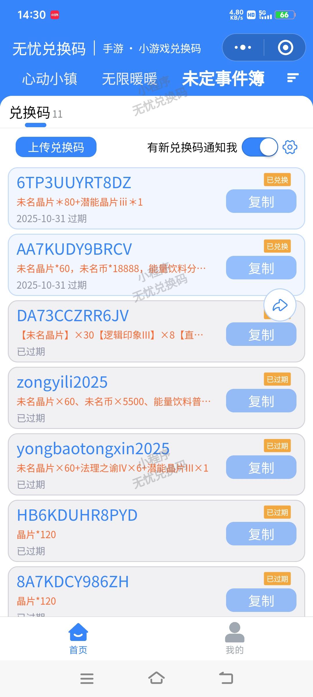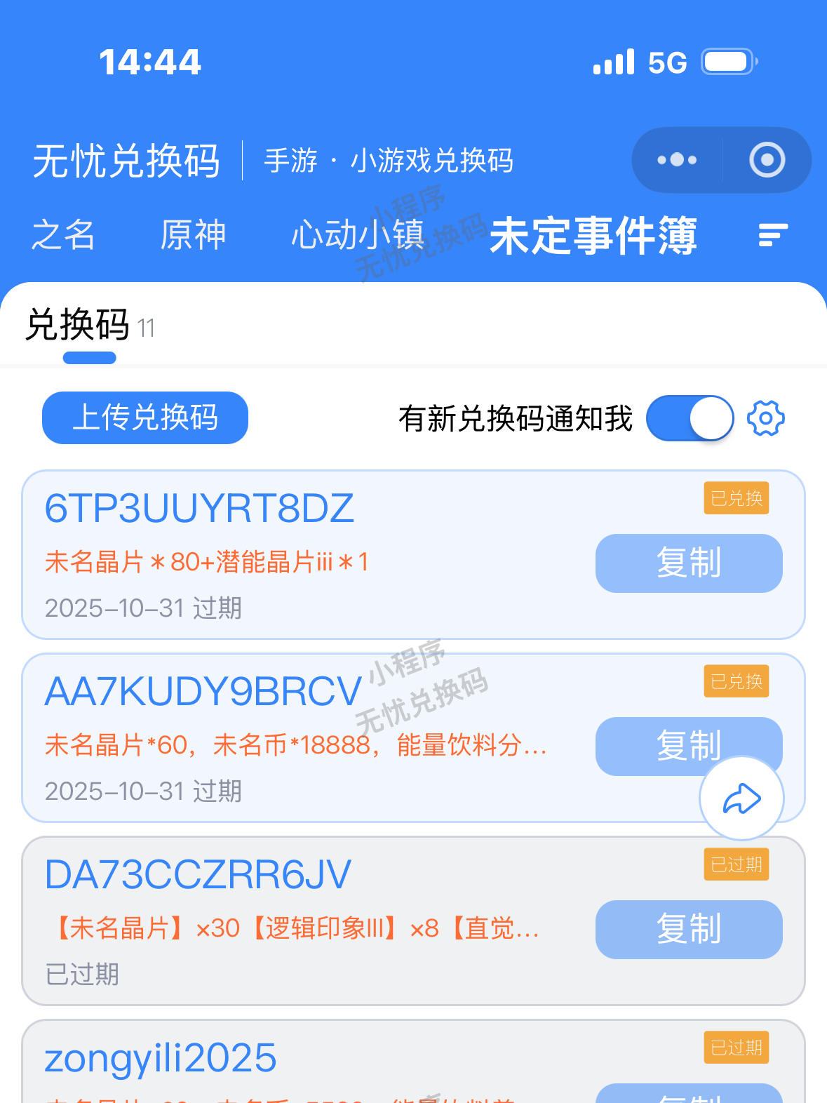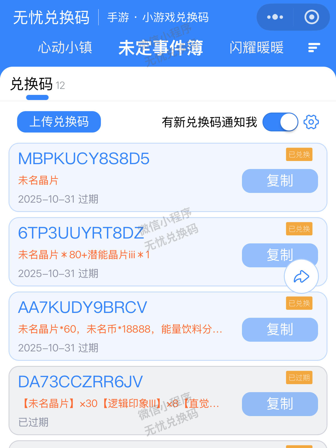 最新兑换码(2025-10-05更新): 6TP3UUYRT8DZ 未名晶片*80+潜能晶片ⅲ*1 2025-10-31 23:59过期 可用兑换码: AA7KUDY9BRCV 未名晶片*60,未名币*18888,能量饮料分享装*1 2025-10-31 23:59过期 已过期兑换码: DA73CCZRR6JV 【未名晶片】×30【逻辑印象III】×8【直觉印象III】×8【共情印象III】 已过