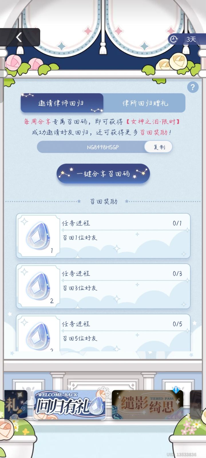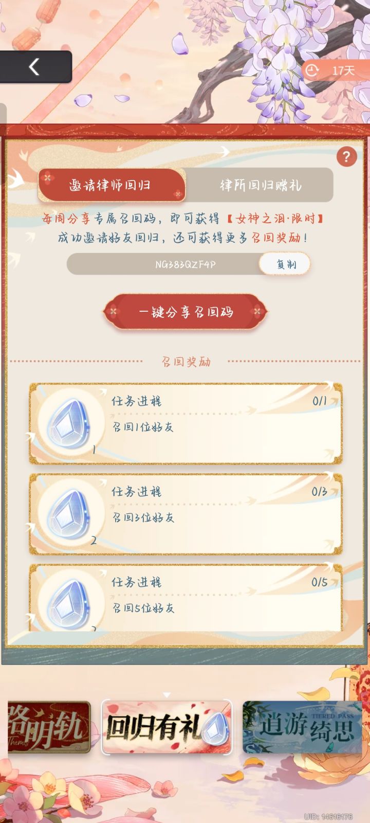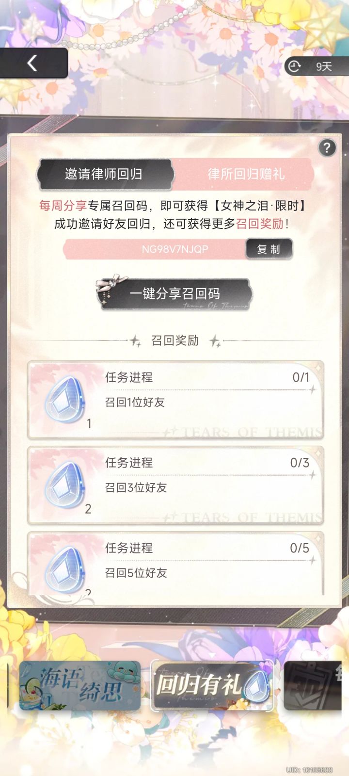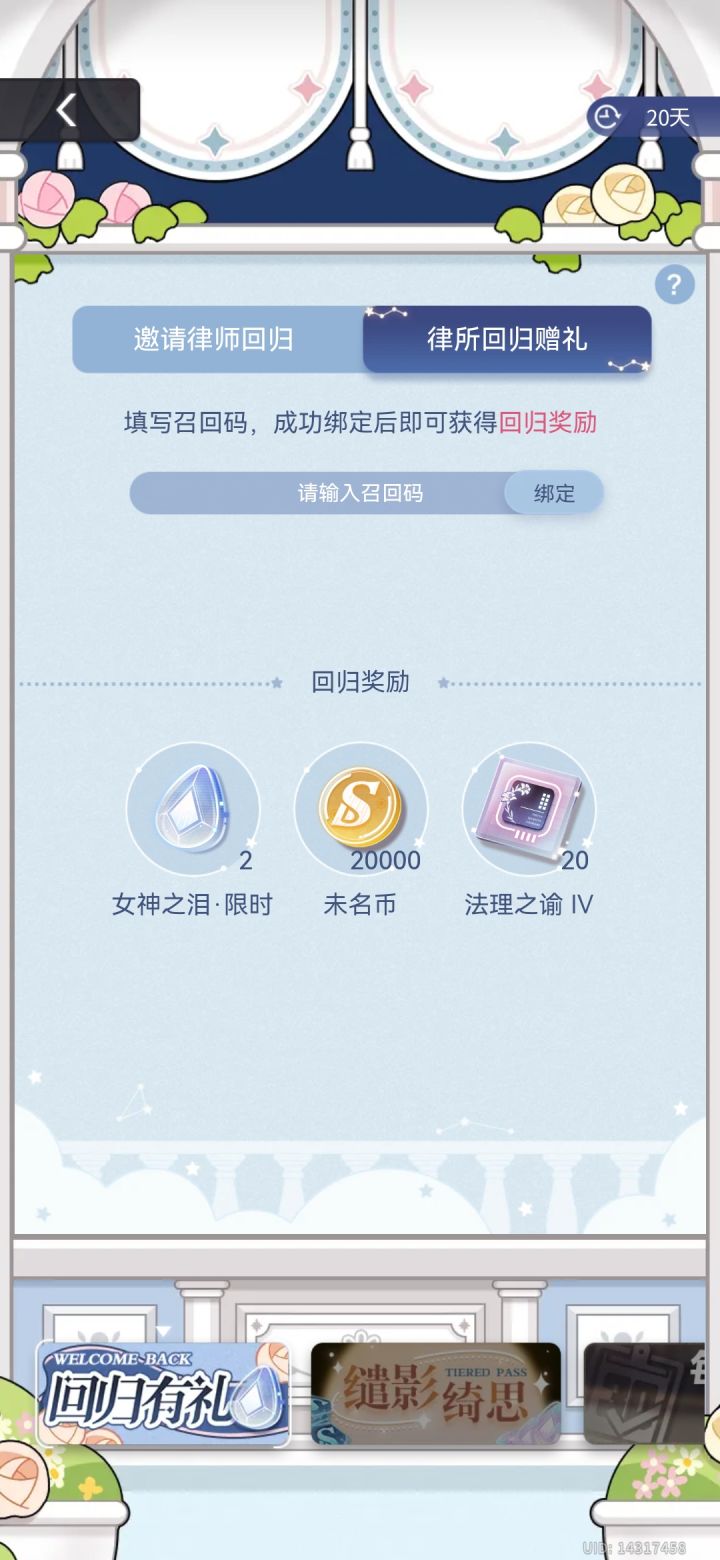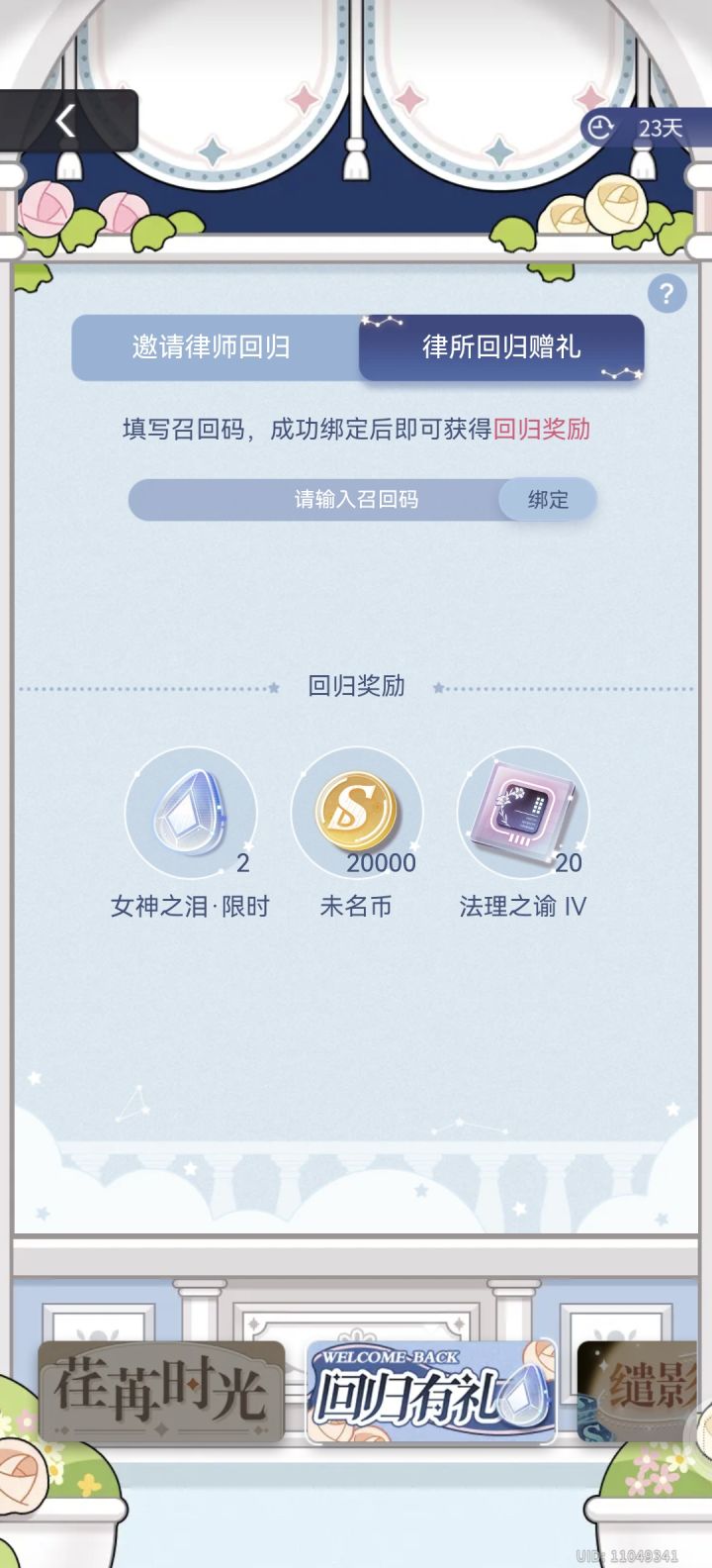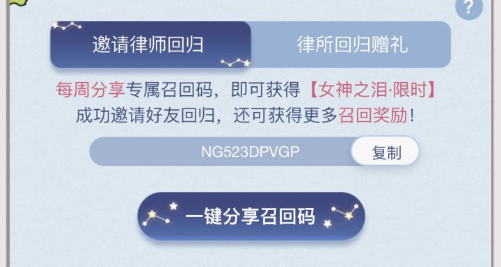 各位想要回坑的夏夫人,左夫人,莫夫人,陆夫人!或者是在回归路上的各位律师小姐们,无论是夏彦的华生,左然的搭档,莫弈的恋人,陆景和的姐姐,都希望看见这个帖子的美丽的夫人们能够帮助帮助我,希望各位回归的人美心善的夫人们能够帮助我填一下召回码:NG6DMQ664P感谢各位夫人们,祝您和您推在未名市度过美好的生活,抽卡10连出彩,您和您推绝配,顶配,天仙配!同时也希望路过的仍旧在未名市的夫人们,能够