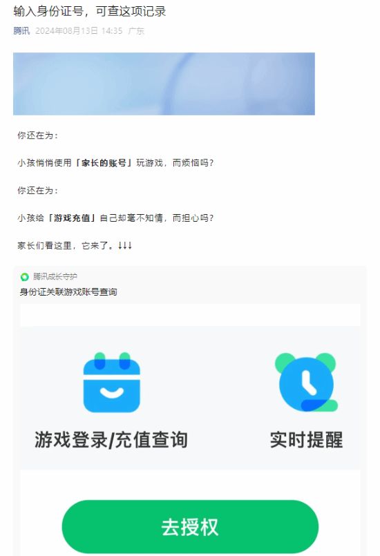 腾讯公布新防沉迷功能,未成年人再也不能偷偷拿父母身份证进行游戏认证了。腾讯公众号今日公布了一项新功能,允许家长通过输入身份证来查询关联游戏账号的动态,防沉迷再上杀手锏。腾讯介绍称,这一功能可以查询自己身份证账号下,一个月内所有腾讯游戏账号登录、充值状态,而且还能实时通知。如果孩子偷偷用父母的身份证认证账号,那只要登录游戏或者游戏充值了,父母就能收到通知。而开通该功能的方式非常简单,家长只需要