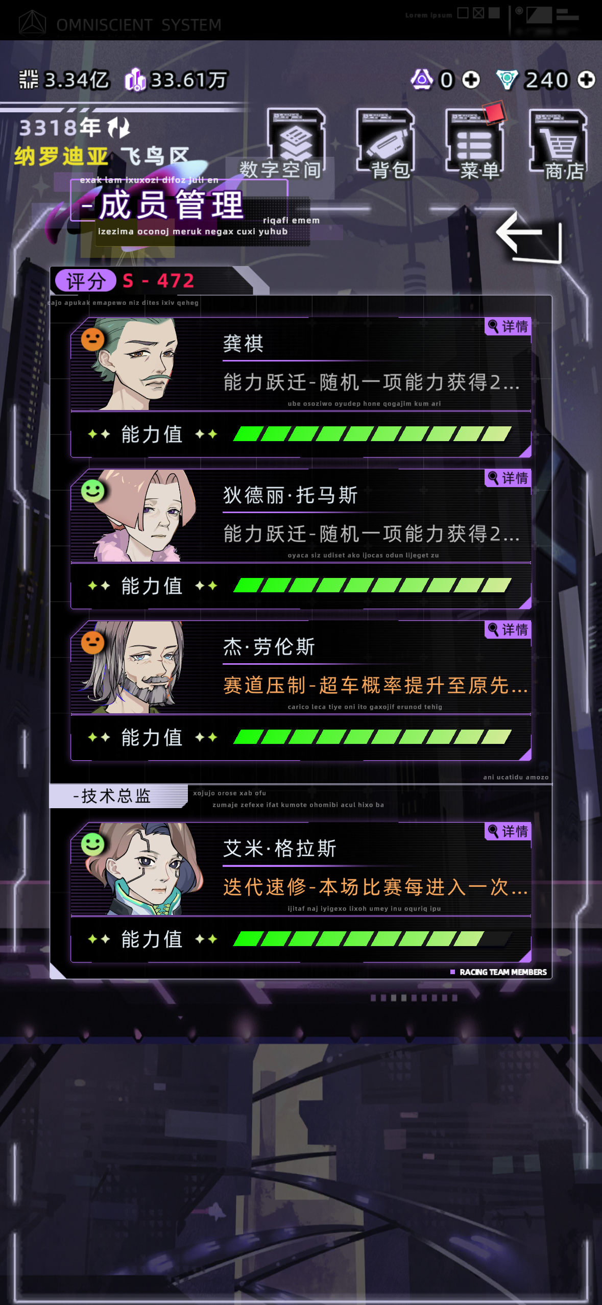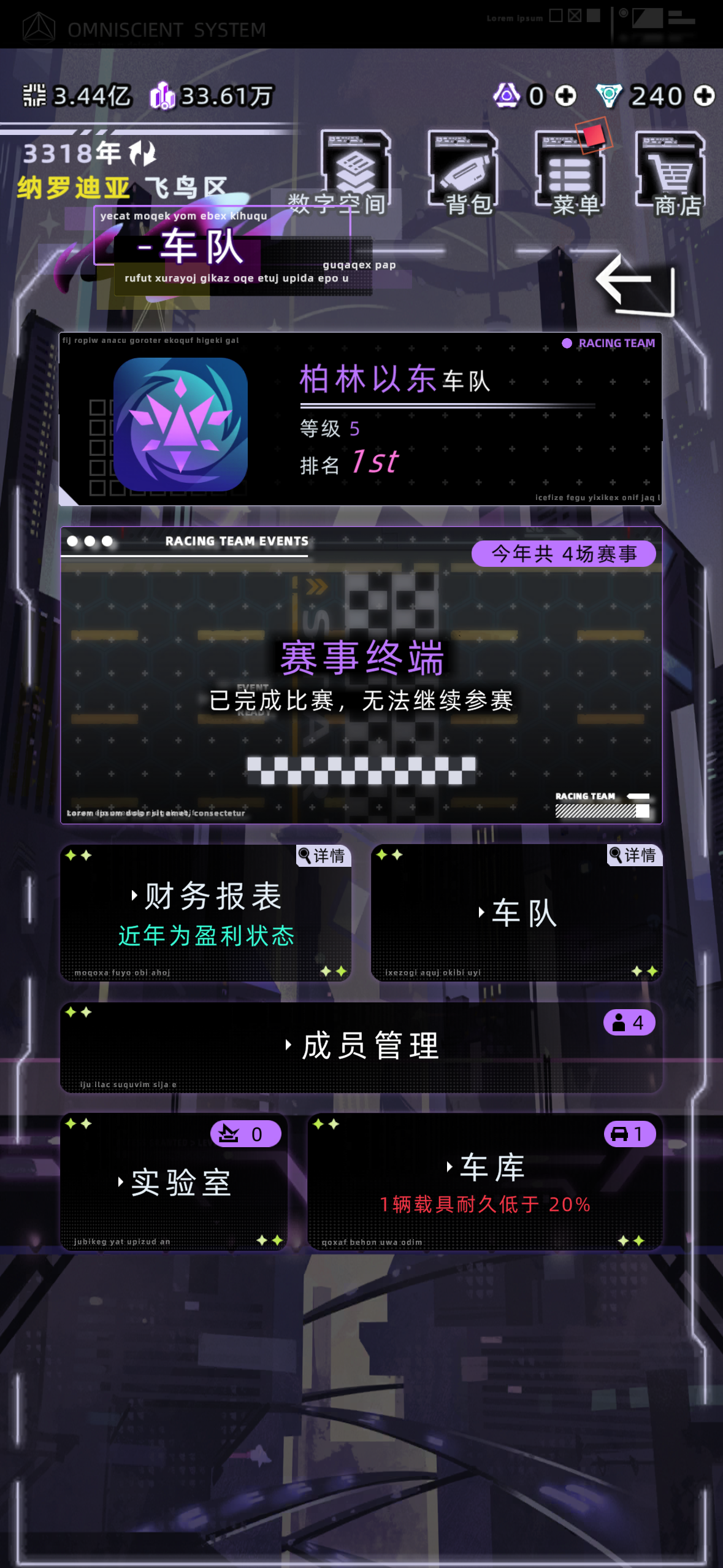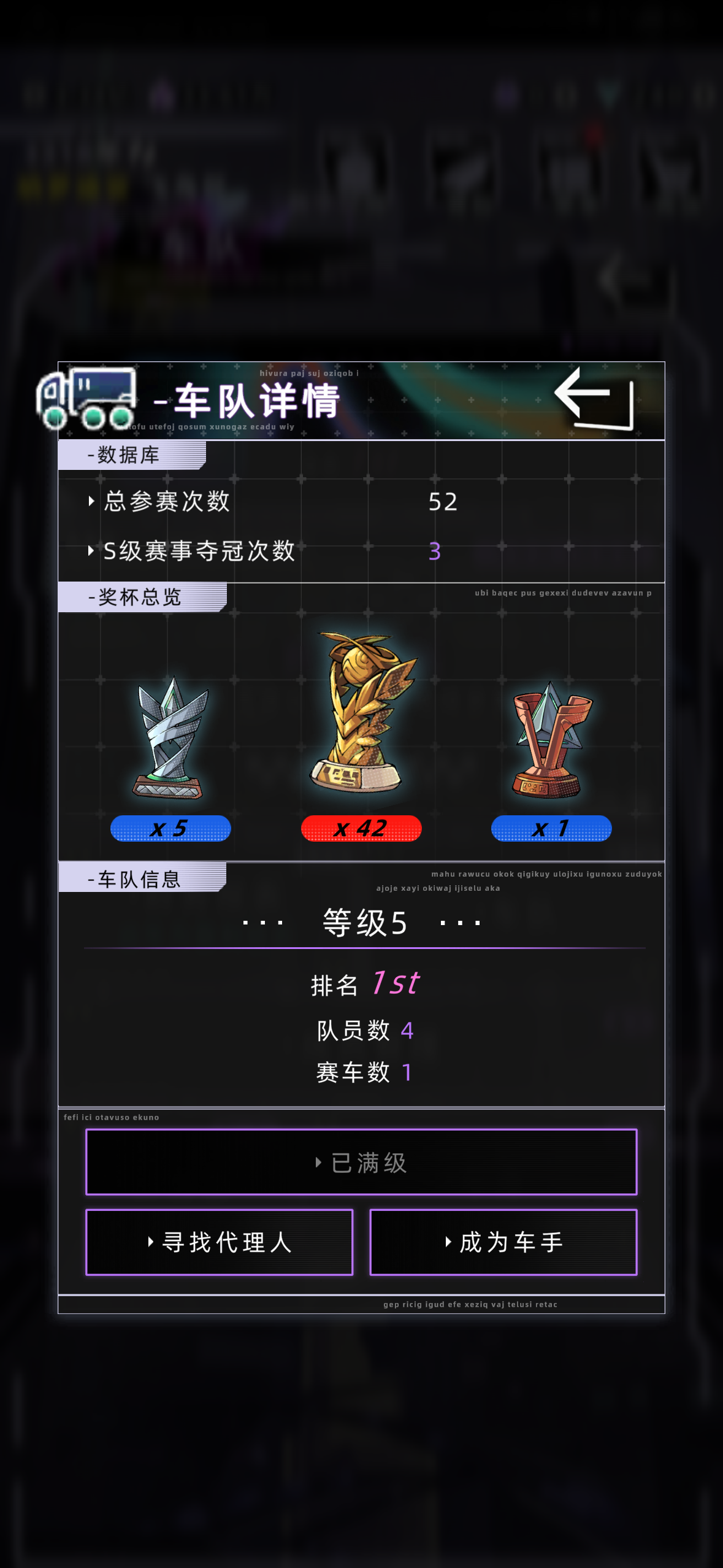 前言:我认为车队最重要的 应该是循规蹈矩车队超好玩!(但所需时间长 建议以20+的岁数开始(我这里是没有高级市民注意:满级车队所需时间长 很花钱!(超级多)我个人是角色22岁创立车队 信用点有2亿 股权3万 宝宝们注意看评论区六楼!攻略开始首先成立车队后 车手与总监大家随便招就行我建议看平均值 前期车手能力在20+放在比赛中已经是最高了车