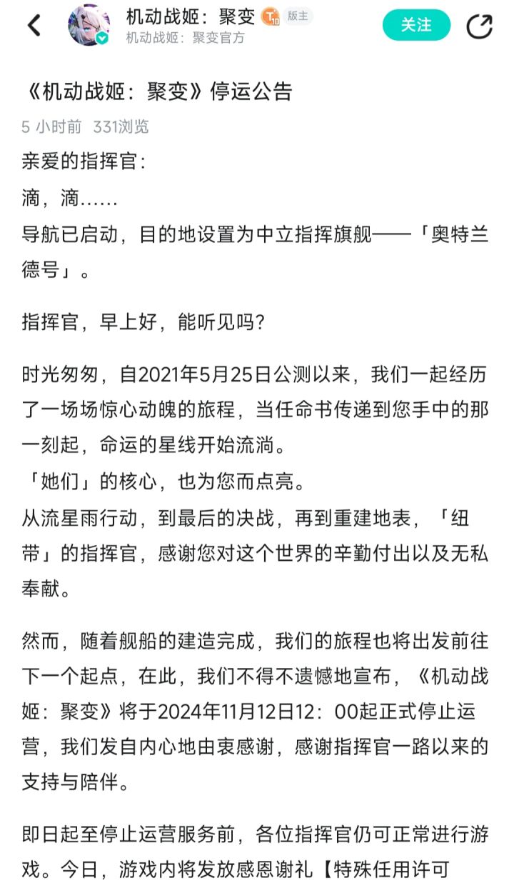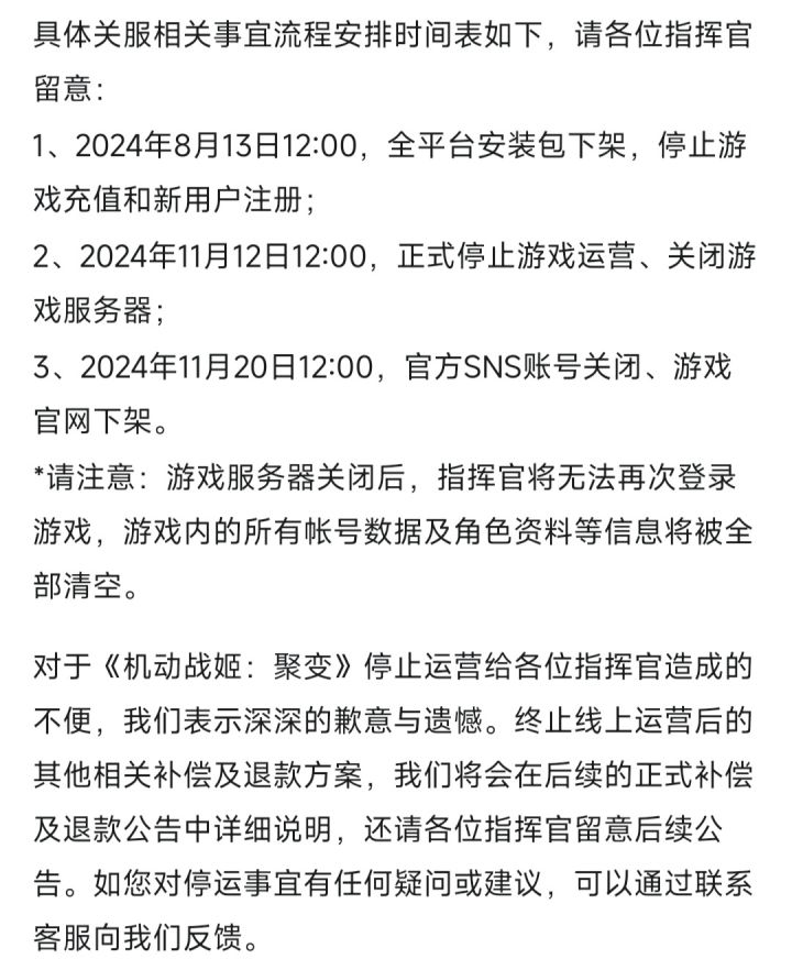 机动战姬聚变宣布停止更新,具体内容可见图片个人看法:B站不愧是手游坟场,不过这游戏起码剧情完结了,也算有始有终了,比很多游戏待遇好多了#今天游戏圈发生了啥 #游戏资讯 #机动战姬聚变 #机动战姬