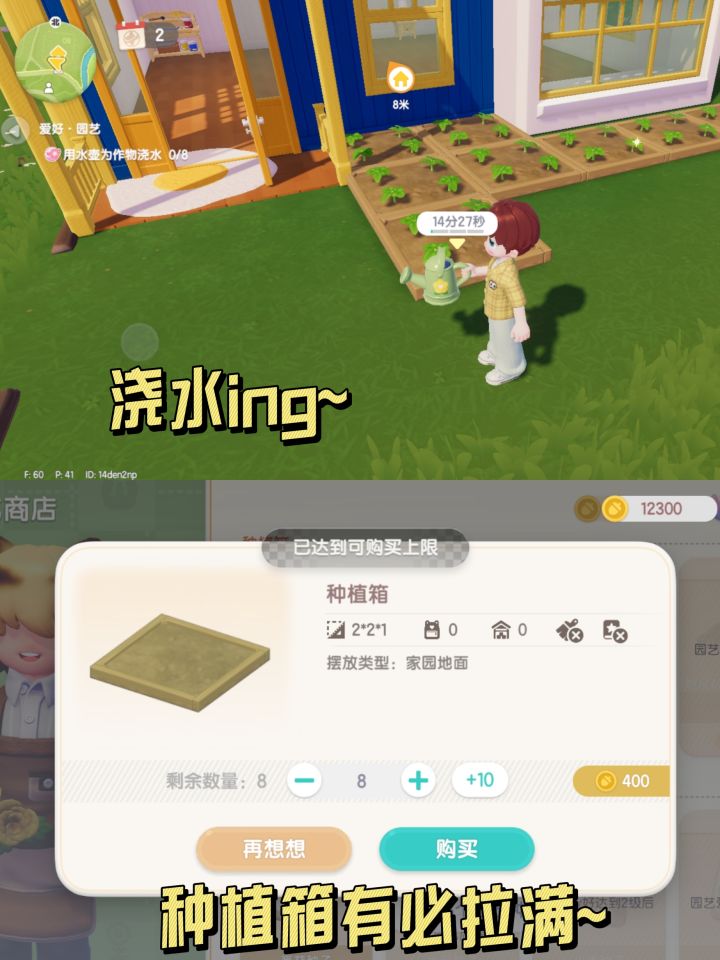 #心动小镇浇水搭子 #心动小镇浇水 #杂交 每天中午或者晚上在群里组织浇水 然后发小镇号和密码 进入小镇号6号集合满12人就可以分组浇1-6一组 7-12一组 你是几号房就跟哪组浇 不需要反着浇 默认浇花浇地(必须要报 以免漏浇后及时找到人补浇 也可避免蹭花不浇水的)漏浇必须及时给补 不然会直接踢出去 小群的缘故有时候凑不够12个就从小镇第一个房子集合开始撒花浇水