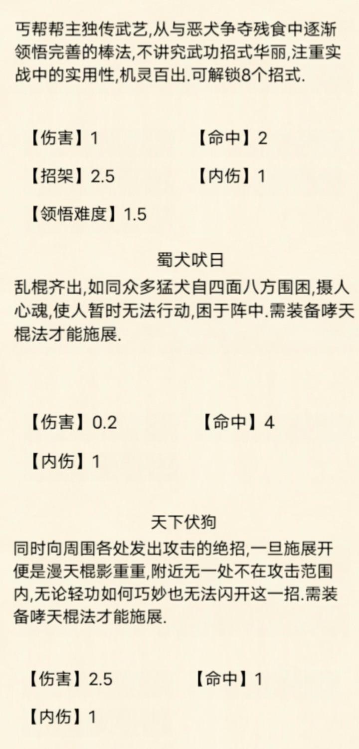 打狗棍法(狗棍)的基础信息如下:狗棍领悟至进阶之后,面板发生变化:狗棍领悟至精通之后,面板发生变化:打狗棍法原本是丐帮门派武学,集强制控制技能,必中技能于一体的武学,作为门派武学,已是拥有不错的机制,但伤害属实感人,最初只能作为霸王枪法的过渡。武学领悟玩法刚出的时候,狗棍有悟性加成,五个口诀中,有三个都是加伤害的,以至于当时狗棍在副本中的表现,能碾压霸十,所以……狗棍怎么能活着走出体验服呢