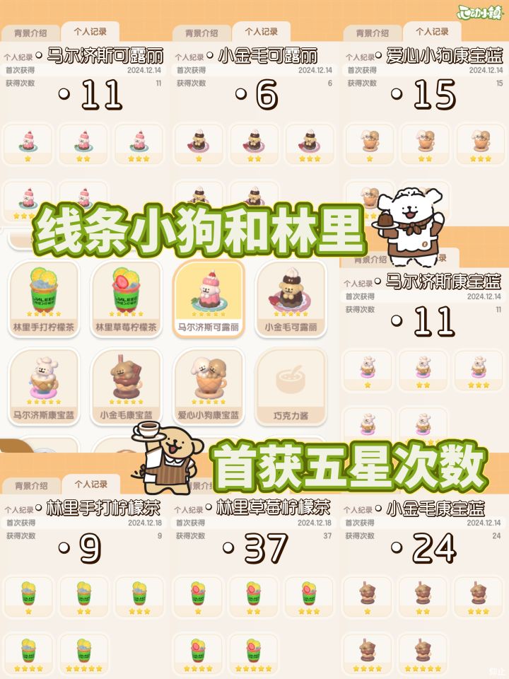 线条小狗甜品和林里饮品七种美食全满星啦⭐我感觉这次比上次奇灵夜季还更好出五星诶—————————— ㋋ ฅ՞• •՞ฅ ㏱ —————————🐶 线条小狗食谱首获五星次数 🍮1️⃣ 马尔济斯可露丽:11 次2️⃣ 小金毛可露丽:6 次3️⃣ 马尔济斯康宝蓝:11 次4️⃣ 小金毛康宝蓝:24 次5️⃣ 爱心小狗康宝蓝:15 次• ── ✾ ── •• ── ✾#下雪天