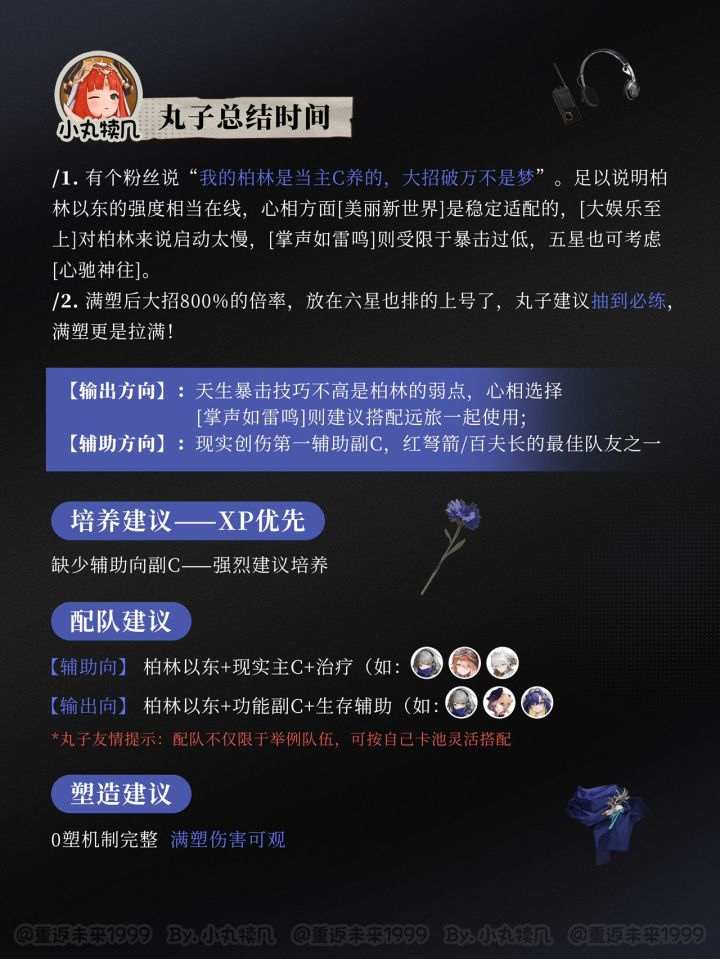 重返未来1999柏林以东角色养成攻略心相配队各位司辰们好呀,本期小丸给大家带来【重返未来1999】 名字:柏林以东 Bkornblume星级:❇️❇️❇️❇️❇️灵感:木创伤:现实创伤1⃣️角色定位2⃣️角色功能3⃣️洞悉材料4⃣️心相推荐5⃣️技能解析6⃣️使用技巧7⃣️抽取建议8⃣️配队思路9⃣️塑造建议等角度全面给出参考建议💬#重返未来1.2绿湖噩梦征集活动#重返未来:1999