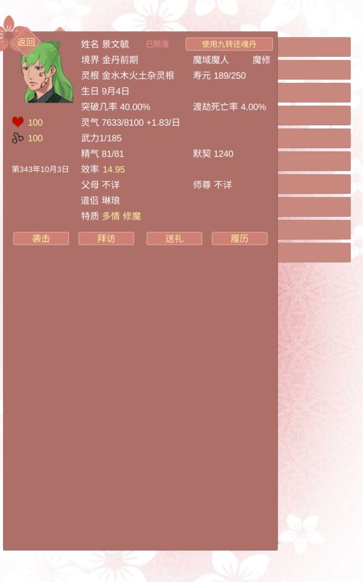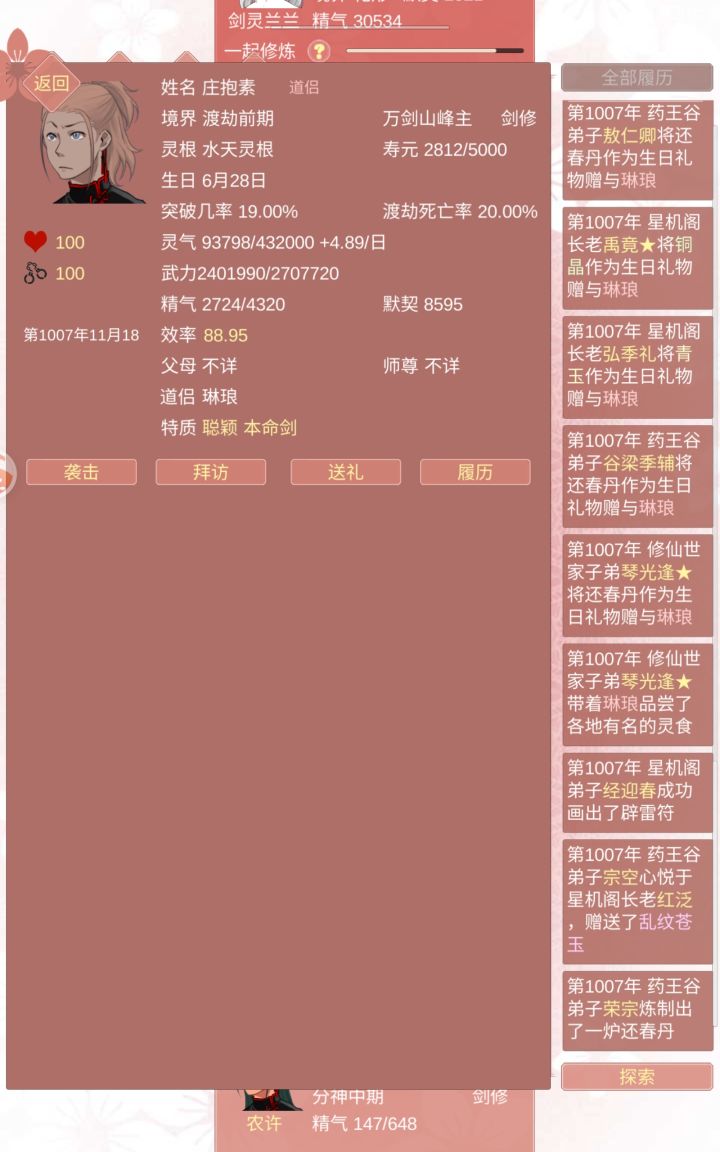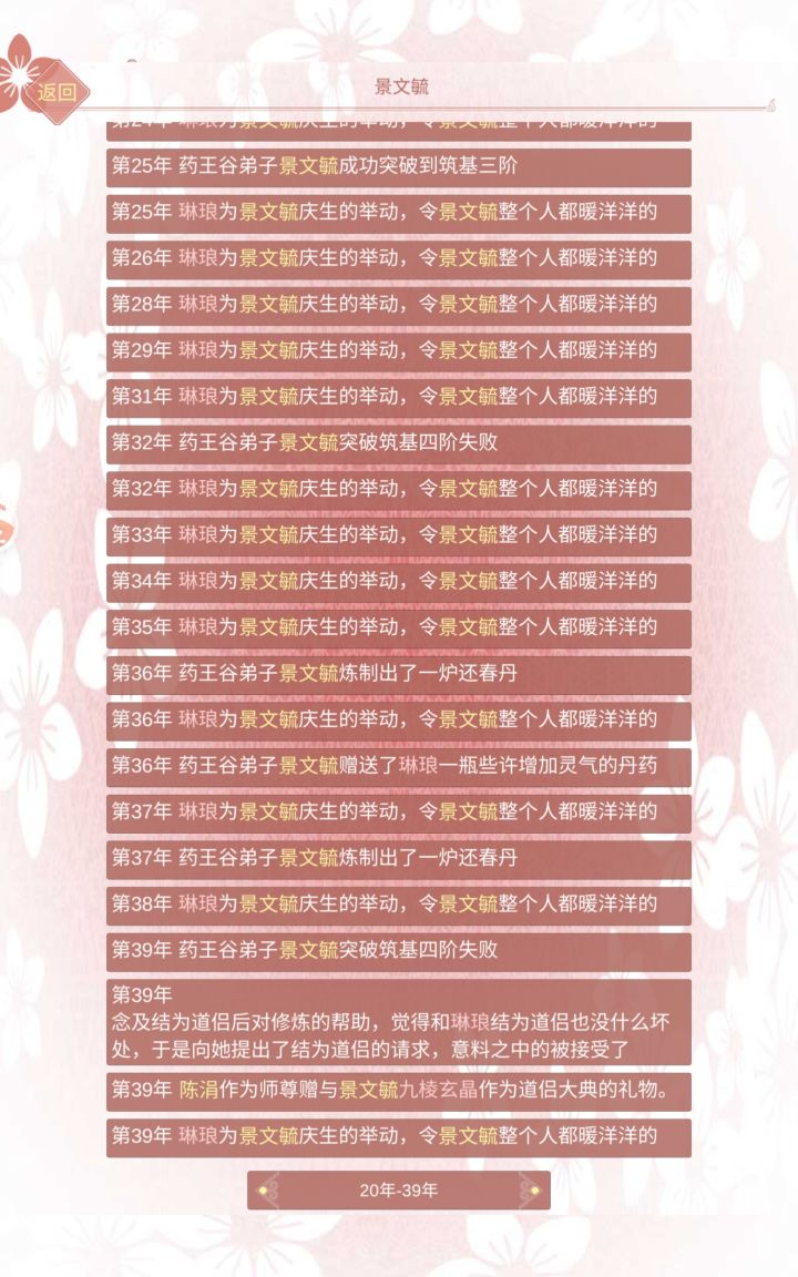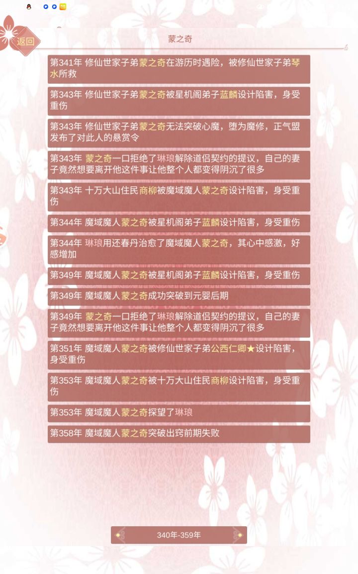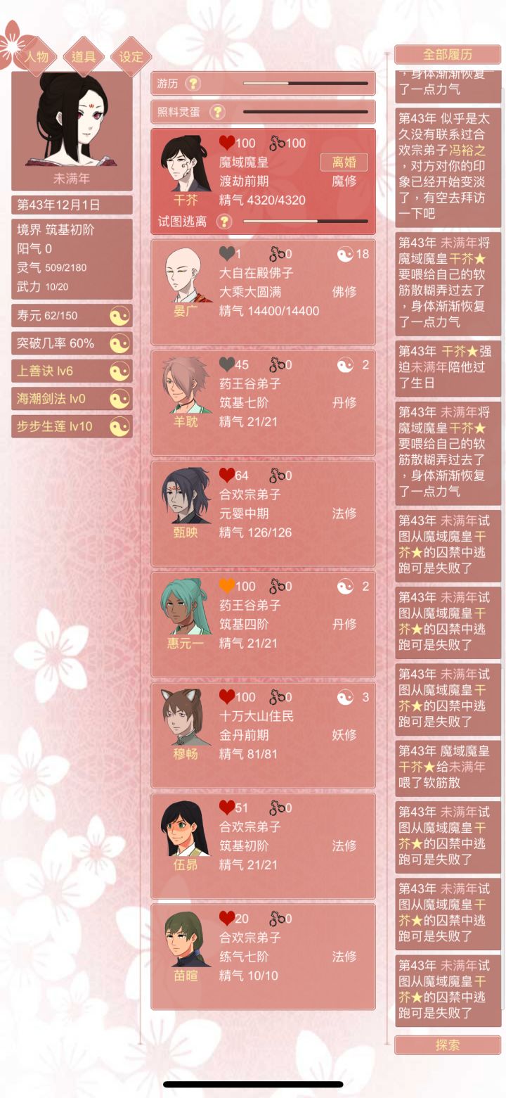 第一任道侣,刚玩游戏什么都不明白,第一年就占了人家元阳,于是39年提出结侣就同意了,结果!!!我在养鱼,你在玩囚禁?结果还给自己玩堕魔了,继续玩囚禁,我真的栓扣啊,放我出去!第二任道侣,找了一个修仙世家子弟,想着一边挂一边养鱼,结果,又堕魔了?!我的功法玩不了魔修好吗?!一直死拖着解不了契,没办法,灌药送走了第三任道侣,真的没必要占有欲生这么高好吗?,直接送走三条鱼,其中一个好不容易刷到的气运