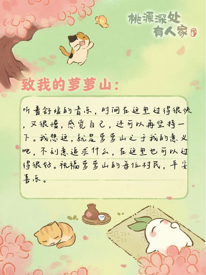 身在桃源,自在怡然~感谢桃源给我这样一隅美好的乐土!两年啦!每个节日都很有氛围感参与感满满,每次剧情中都会让人感慨又让人释怀,是属于我的桃源没错了!经常和群里的小伙伴们一起玩开心地玩耍,越来越喜欢我用心打造的家园,喜欢我可爱的小萝卜们,还有善良亲切的村民们!愿我们岁岁年年常相伴!(*≧▽≦)ノシ))#桃源二周年生日宴 #致我的萝萝山