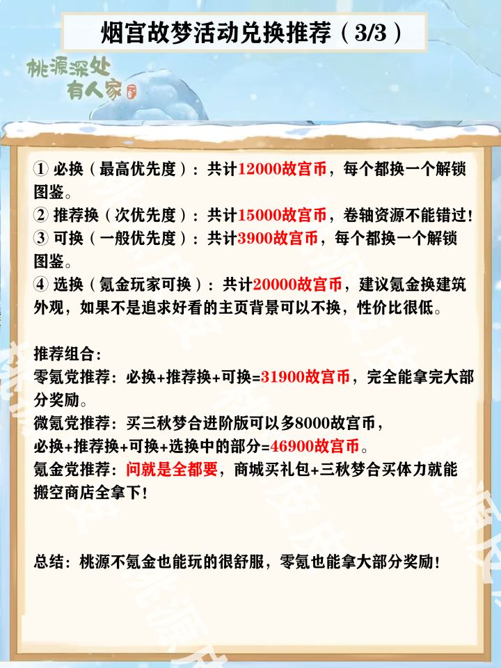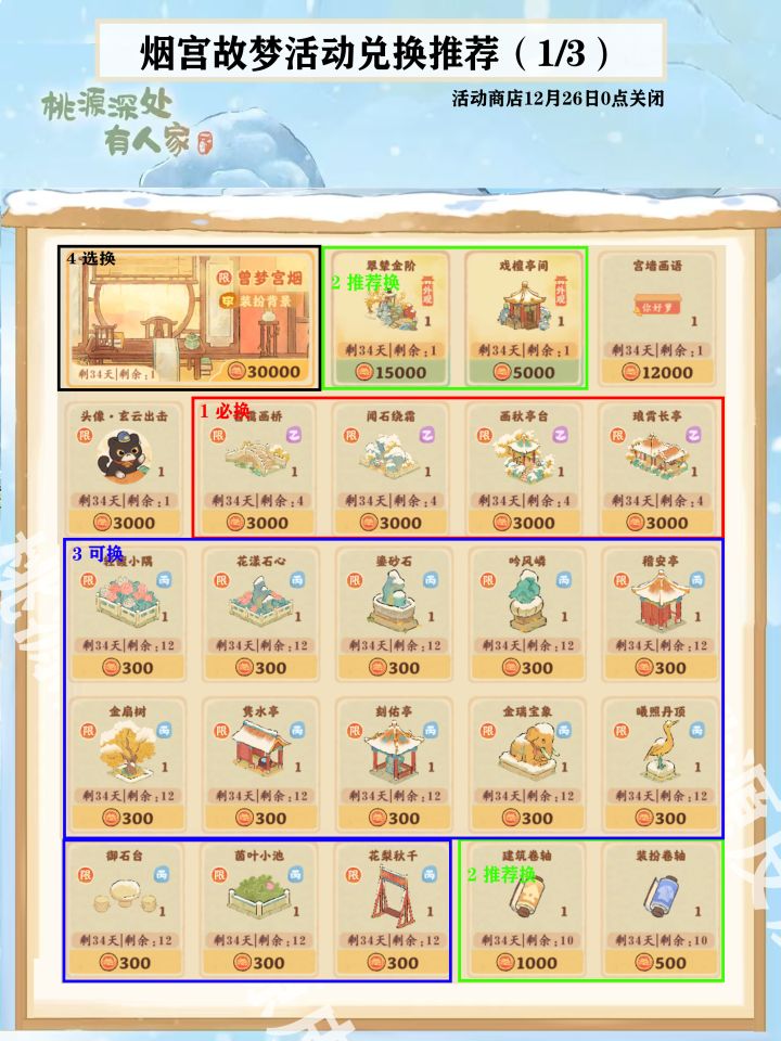 兑换推荐顺序见图1,建筑和装饰拿下,卷轴也拿下,剩下的看剩多少故宫币再做决定。活动故宫币获得数量一览(图2): ① 游苑逐忆:综合玩法,等于活动任务,可获得4000以上故宫币。 修缮手册有7000故宫币。② 匠梦千秋:7章共获得10500故宫币。 ③ 宫苑闲娱(11月28日开启):两则新的小游戏,猜测可获得 6000故宫币。 ④ 画宫拾穗:与新活动地图中的元素互动获得奖励,最少可获 得9