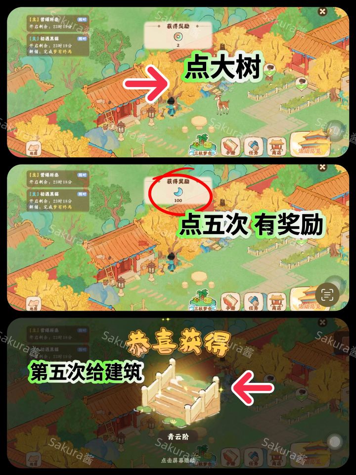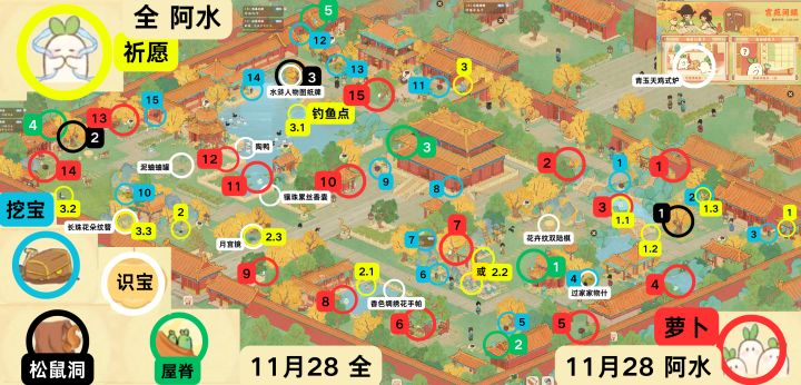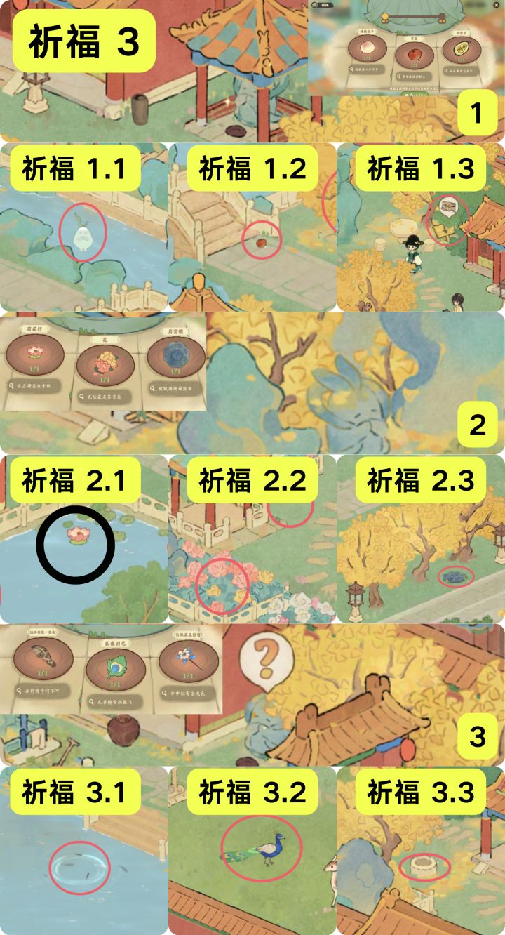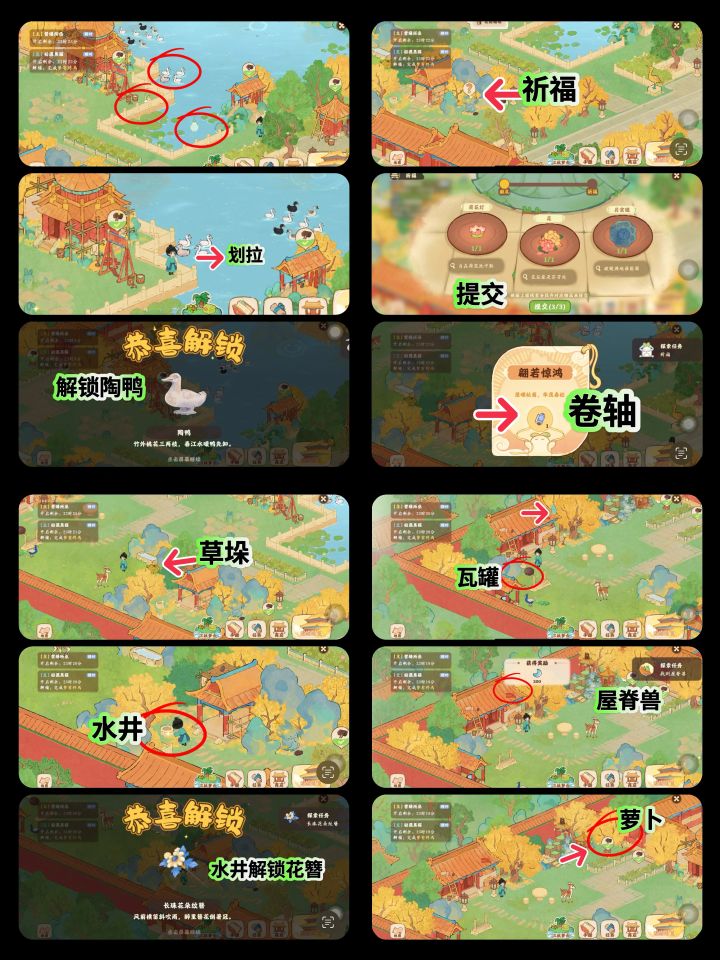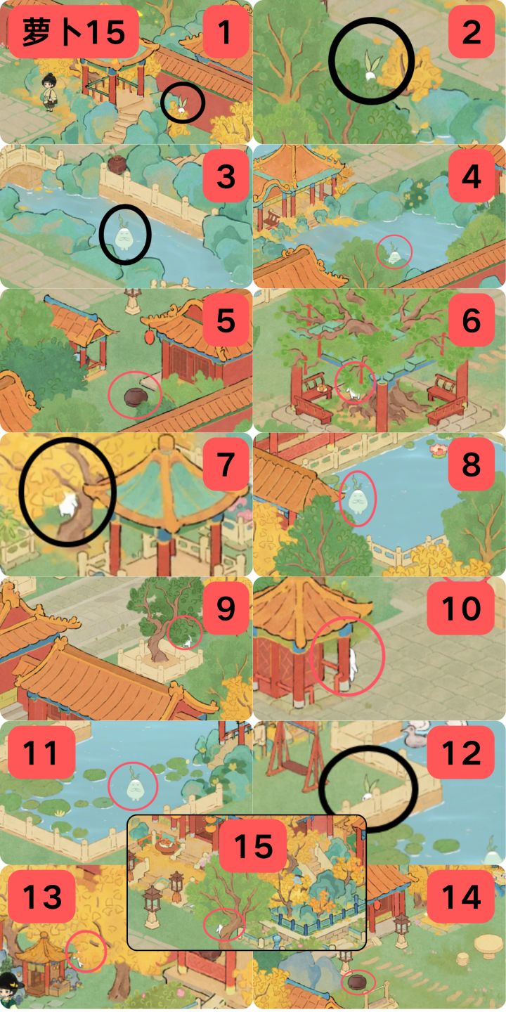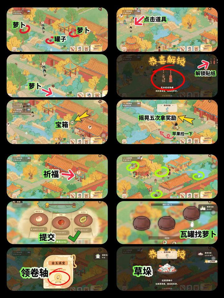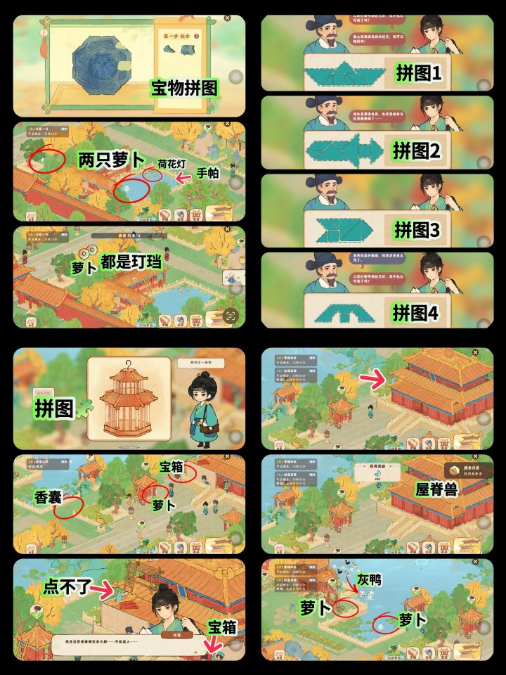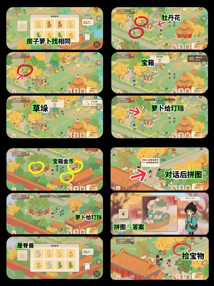 图1 攻略顺序大图图2 萝卜详细(15个)图3 挖宝详细(15个)图4 识宝详细(10个)图5 祈福详细(3大个9小个)图6 屋脊+松鼠洞(5个,3个)ps:合成小游戏小技巧,有些产物不会转化为活动币,只有消耗体力的在结束的时候没有采集会转化为活动币,多挖的话, 不仅浪费体力, 还少了活动币#桃源深处有人家 #桃源深处有人家攻略 #桃源宫烟故梦