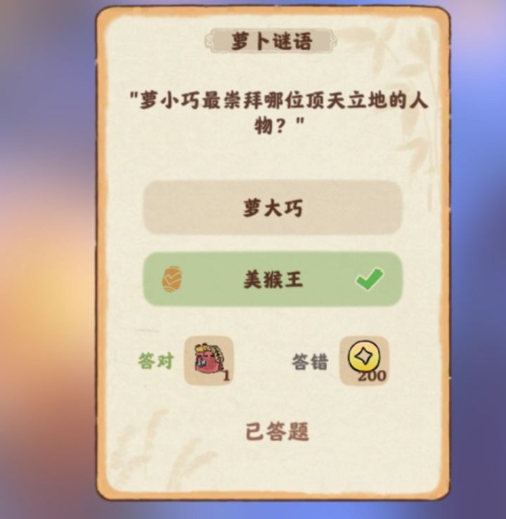 1月8日千灯彩树答案:美猴王(第二个)❗❗❗ 萝卜谜语问题:"萝小巧最崇拜哪位顶夭立地的人物?"答案:美猴王(第二个)今天的你得了多少奖励呢?建筑为商店(商店10级开启)六元彩树~#游戏种草计划#桃源深处有人家#桃源深处有人家千灯彩树#千灯彩树答案#游戏攻略