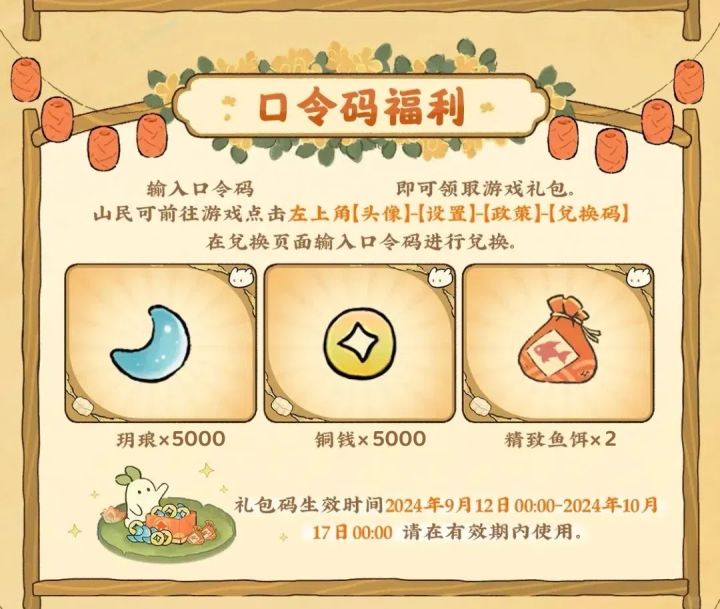 桃源10月最新礼包码来啦!!包含玥琅x5000 铜钱x5000 精致鱼饵x2等兑换码:玉成山河兑换码:秋思朝月兑换码:WELCOME[专属礼包]:玥琅x5000铜钱x5000精致鱼饵x2兑换码:Tyj666兑换码:肥猫家润兑换码:坐看山水兑换码:悠然见桃源如果遇到兑换失败的情况,请及时评论区反馈!(更多礼包攻略)持续更新中,感谢大家的支持!#桃源深处有人家 #桃源深处有人家
