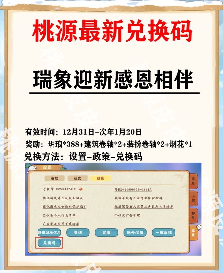 有效期:12月31日-次年1月20日奖励内容:玥琅*388+建筑卷轴*2+装扮卷轴*2+烟花*1兑换方式:设置-政策-兑换码#桃源深处有人家 #桃源颐养四时
