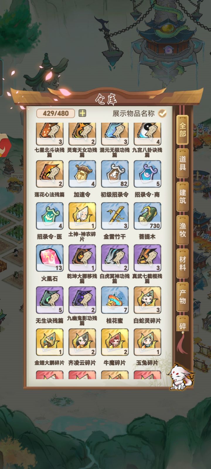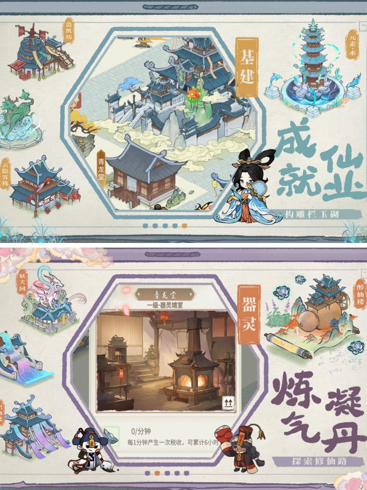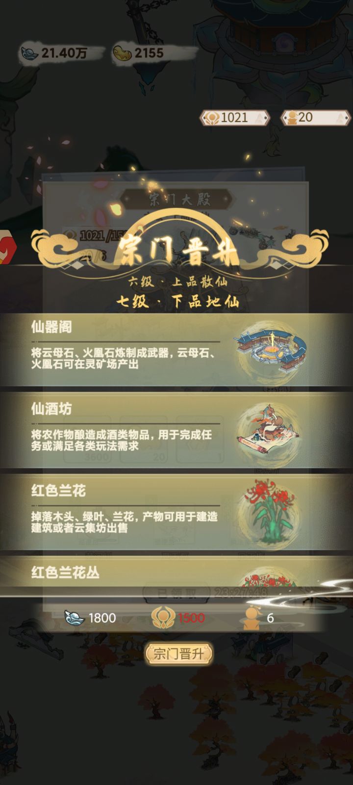 木克土土克水水克火火克金金克木仙酒坊一级需宗门七级酿酒仙药酒*1 仙稻*5龙涎琼浆*1 仙稻*25桂花蜜*1 仙稻*5兰花*2(兰花种植树木获得)紫府琼露*1 仙稻*25玄冰花*1(玄冰花种植树木获得)仙器阁一级需宗门七级矿石制成武器桃花剑*1 云母矿*10(云母矿灵矿场获得)宗门八级解锁:仙虎园*1,功法阁,灵木场,仙药园*4妖犬园*2仙禽园*2灵矿场*2仙稻田*8弟子