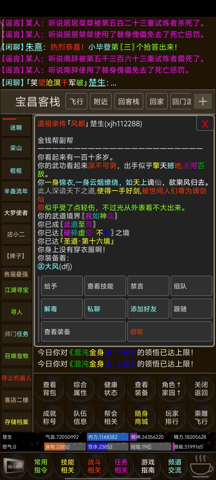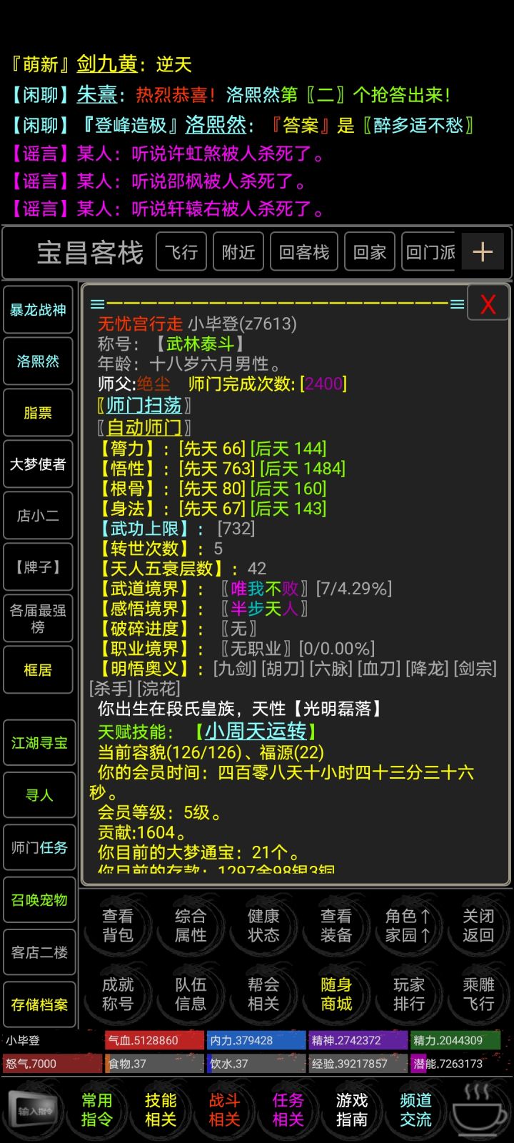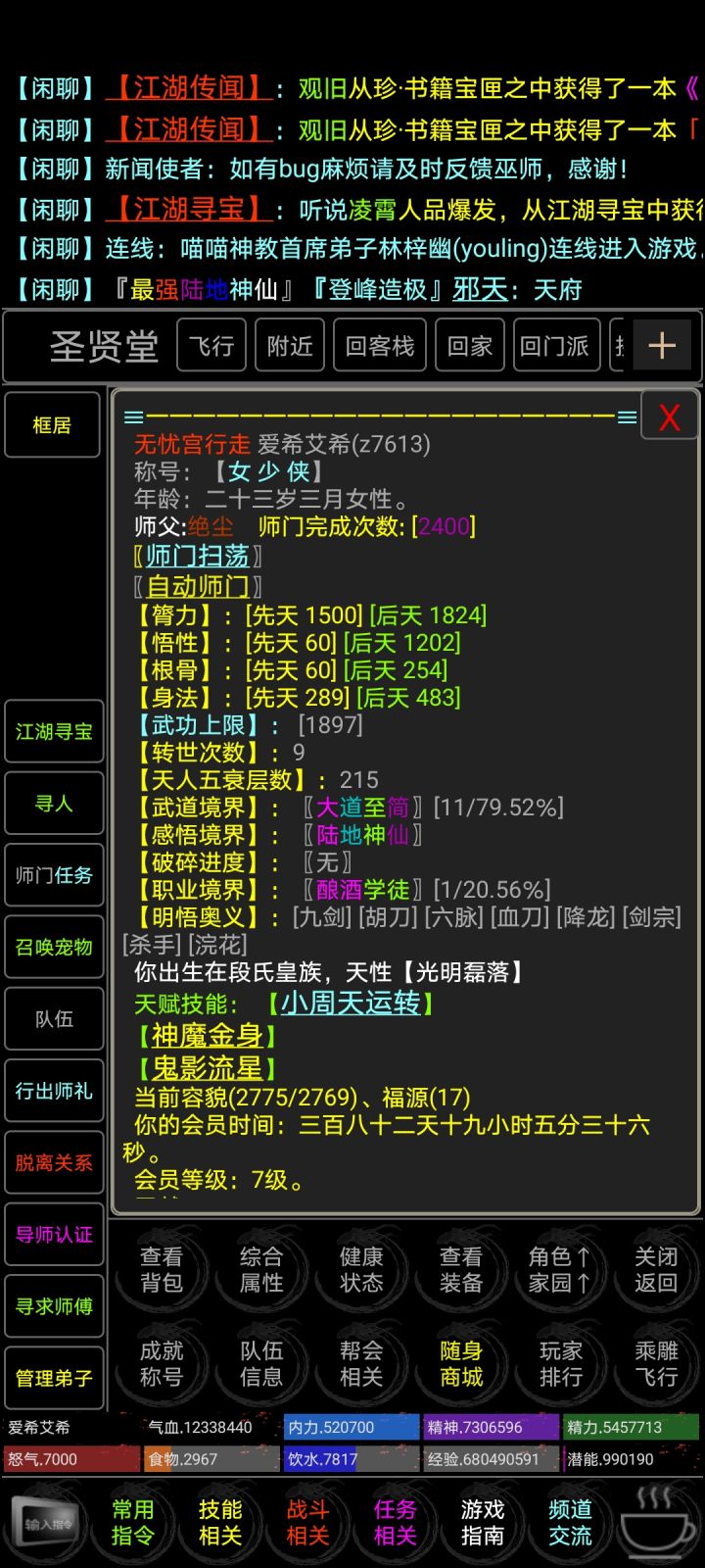 本人已达陆地神仙境界,望周知 历经无数次的踩坑以及与老毕登的斗智斗勇,我也是终于到神仙了,可惜之前的比赛一个没打,原因无他,太菜了打不过。不过问题不大,反正平常就是个咸鱼,也不追求更高的境界,还是老生常谈的一句话,游戏嘛,快乐才重要(反正闲的没事欺负一下小师弟纪如梦我是挺快乐的)。 再谈谈这个服的特色吧,东西相较于传统mud多不少,门派多了一堆,功能物品也多了一堆,还有百键之类的增加玩家体验的