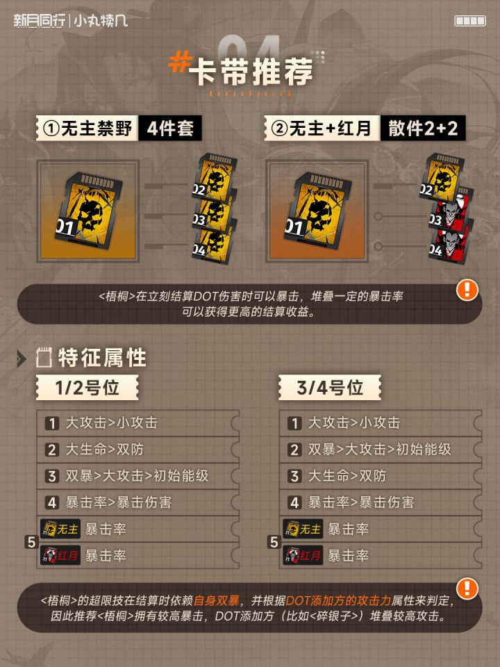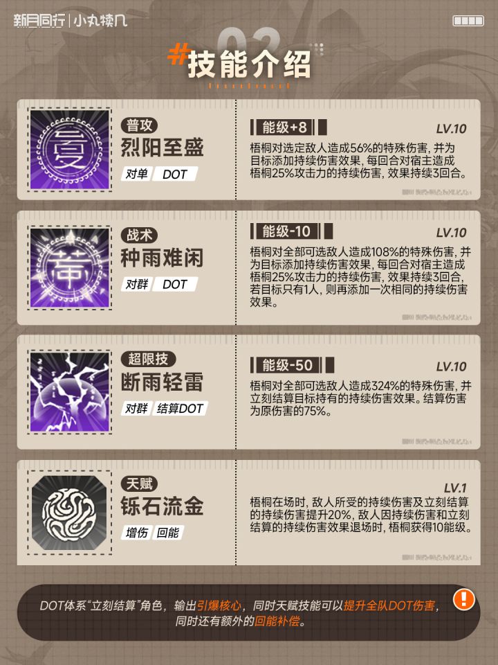 #新月同行梦游青山 #新月同行 #新月同行攻略 #梧桐 #游戏种草计划 tada~这里是小丸!新月同行迎来了1.0.2下半版本啦!本期带来的是下半的UP角色养成攻略!角色:『梧桐』星级:❇❇❇❇❇❇灵感:特攻&奇阵营:独行势力定位:DOT输出&引爆1⃣角色定位2⃣养成材料3⃣卡带推荐4⃣技能解析5⃣设施专长6⃣认证介绍7⃣抽取建议8⃣配队思路9⃣门阶建议等角度全面给出参考建
