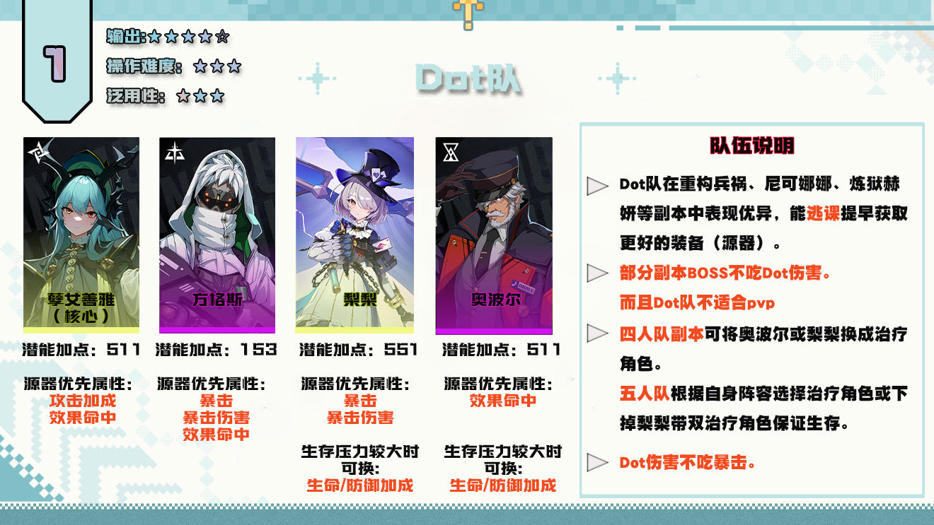 1、 dot队绝对舒适区。 2、常规队伍 要求输出够(练度不够往下看),也就是C位练度要高。尽早击杀boss,避免被兵祸叠攻击减员一波带走。 梨梨可替换多琪。 3、嘲讽队(不要上缬草当治疗) 理论上嘲讽不掉+双治疗+C怎么都能磨死,但也只是理论上。所以还是建议C位强一些。 炼狱就先不写了,炼狱还没开。等开了再拉一下源器智壳试试。我是不推荐用弥瑟亚主C打的,这个角色的输出比夜离低一截,打的很慢。 #