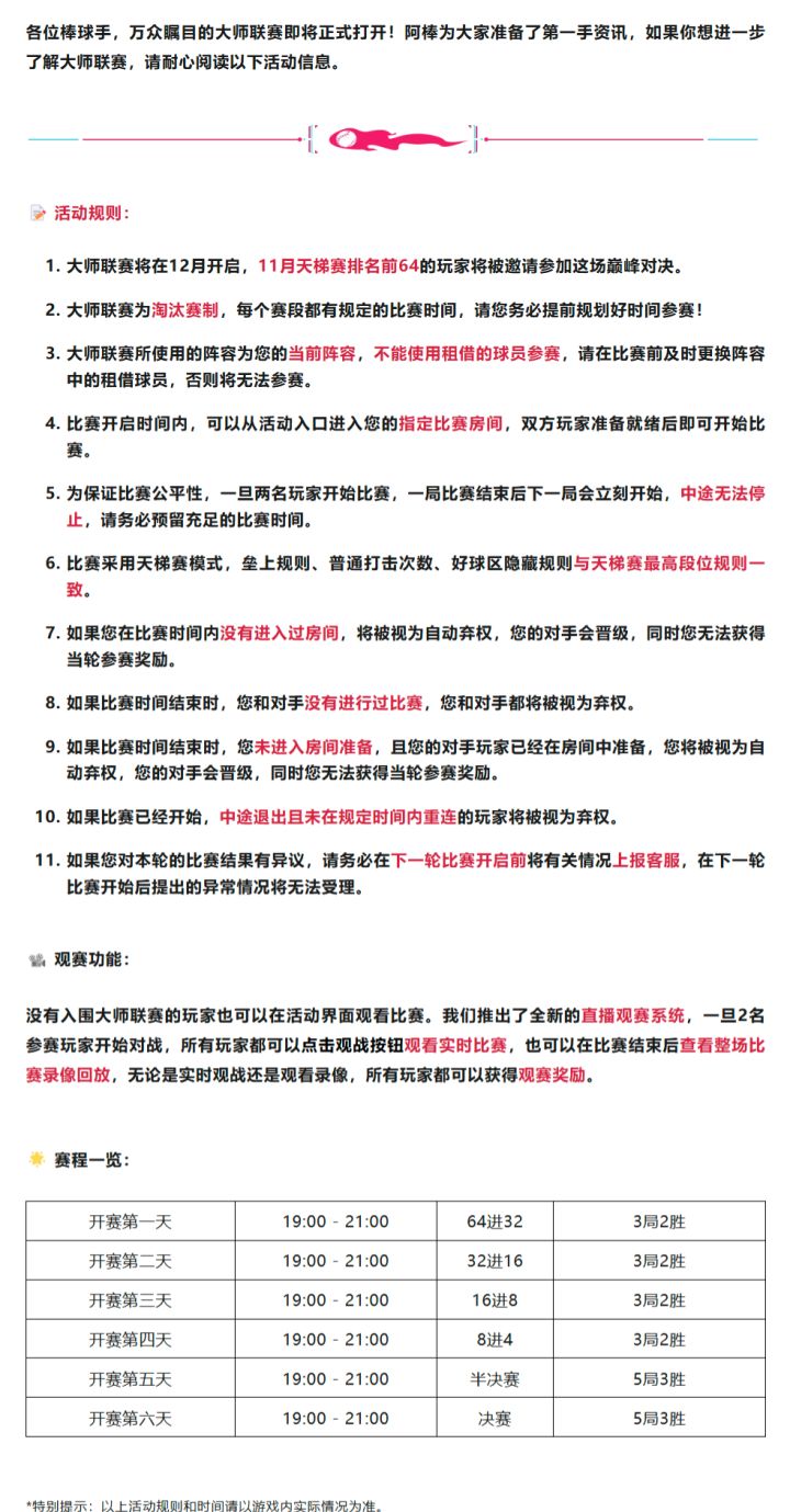 亲爱的棒球手们,你是否在期待一个与高手切磋的机会呢?全新PvP活动大师联赛将在12月初盛大开启。开赛前一个月天梯赛排名前64名的玩家将获得比赛资格,与顶尖对手一决高下!在棒球场上,展现你的技巧和策略,争夺最高荣耀与丰厚奖励。无论你是新手还是资深玩家,只要你敢于挑战自己,就有机会成为最终的赢家!提升你的技能,磨练你的战术,为即将到来的大师联赛做好准备。特别提示:以上活动细节和时间请以游戏内实际