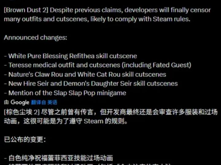 🍉棕色尘埃2:为了扩圈 决定大和谐!大过年的又出现大的啦家人们!这次出事的,是由韩国NEOWIZ公司开发,特色为颜色因素的角色扮演游戏《棕色尘埃2》! 据悉,在1月9日晚六点开启的特别直播中,《棕色尘埃2》官方宣布了一个重磅消息,为了在全球范围及各平台维持稳定的服务,将对多位角色的外观相关设计进行调整图5,此外,部分角色的皮肤互动内容也惨遭处理图4相关消息一经发布,立刻在玩家社区中炸开了锅
