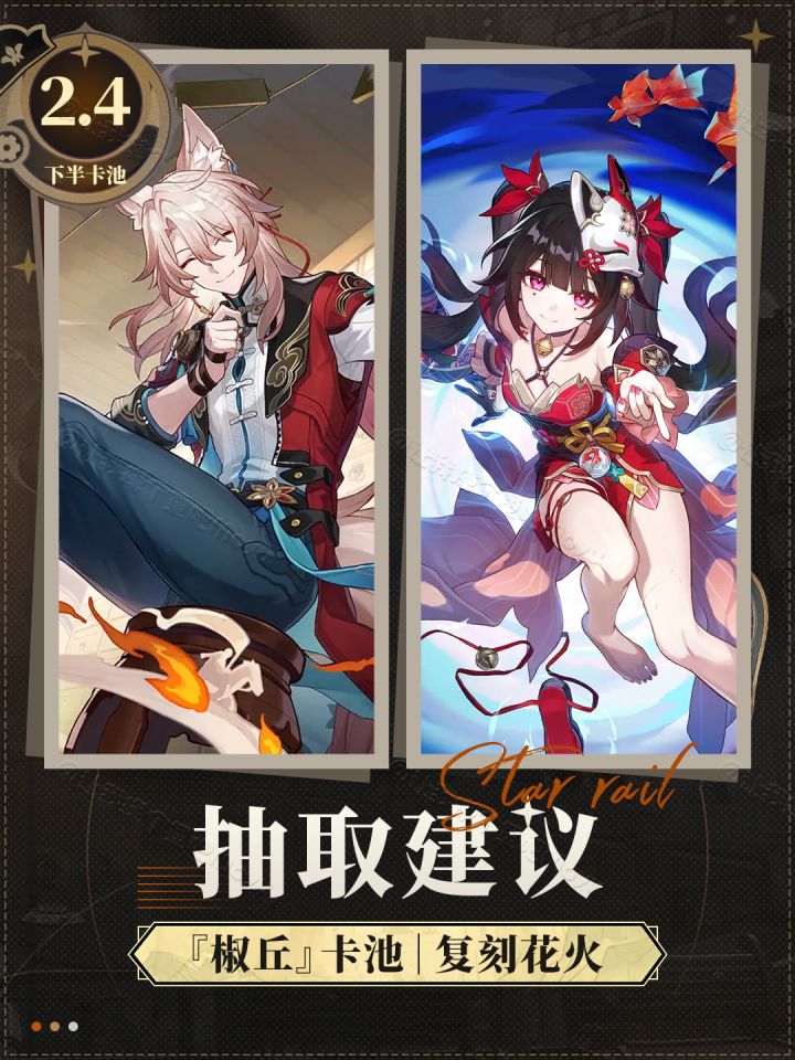 UID:104347362将将!摸鱼驾到!(。•̀ᴗ-)✧这次给大家更新了崩坏星穹铁道,2.4下半角色——即将上线的曜青随军医士·『椒丘』卡池的抽取建议;文中包含了【角色/光锥卡池】UP的复刻角色——『花火』以及陪跑4星的信息—————— ฅ՞• •՞ฅ ———————觉得有用的话,记得关注摸鱼酱💓!角色正式上线后会及时发布正式攻略《摸鱼笔记》哒!鱼鱼们蹲蹲#崩坏星穹铁道 #崩