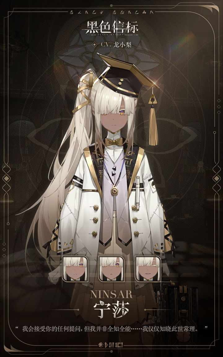 >>>楔文会-馆员秘闻|宁莎·塔斯尼「我会接受你的任何提问,但我并非全知全能……我仅仅知晓此世常理。」CV——龙小梨〓▁ ▁ 关于她______楔文会有史以来最杰出的古物修复专家,无出其右的博学者,恩基的胞姐。知晓古往今来一切奥秘,却也因此认为世事枯燥乏味。举止稳重低调,除弟弟恩基以外,世上已无可令她惊奇之物。在世界历开始之前,与恩基一同踏入巴别图书馆的无穷房间之中,做好了再也不会返