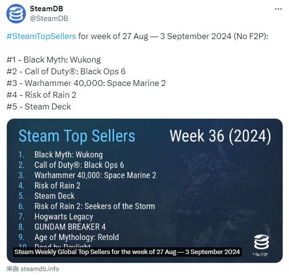 9/3号,SteamDB更新了第36周(8月27日至9月3日)的游戏销量榜❗❗❗《黑神话:悟空》热度火爆,达成四连冠《使命召唤:黑色行动6》拿下第二名《雨中冒险2》,由于DLC发售,飞升第4STEAM周销榜Top10如下(已排除免费游戏):1.《黑神话:悟空