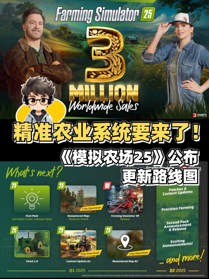 经典模拟经营游戏《模拟农场》系列自2024年11月12日发售最新作《模拟农场25》以来,已在全球范围内售出超300万份,而整个系列的累计销量更是突破4000万!这次官方公布了此游戏的后续的更新路线图,新DLC、新地图和精准农业系统即将陆续上线,各位农场主们你们准备好了吗?🚜🌾公布的路线图包括:• 第一季度更新:发布首个DLC,预计带来新作物、新农机等内容。• 免费内容补充:1.6补丁将加入两