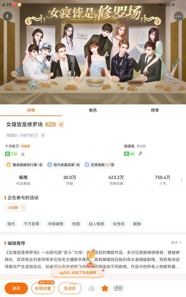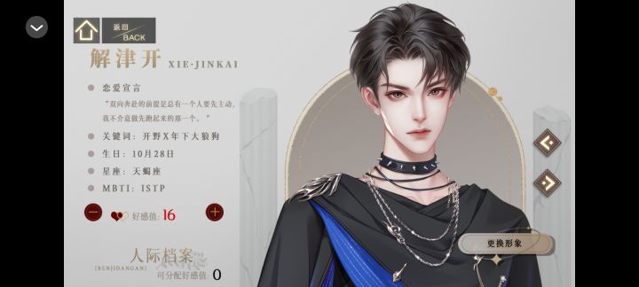 看到更新处真的被剧本的文笔惊艳到了,太喜欢了!爱情观都很正,是我玩的这么多的里面最新欢的一个(本人很喜欢玩剧情向) 而且立绘可以自己选择真的每一位的立绘都很漂亮帅气(女嘉宾们也都好美丽)哈哈哈推荐喜欢剧情向的姐妹们来玩玩这个呀#橙光 #橙光游 #橙光立绘 #橙光分享任务 #橙光推荐 #橙光游戏推荐