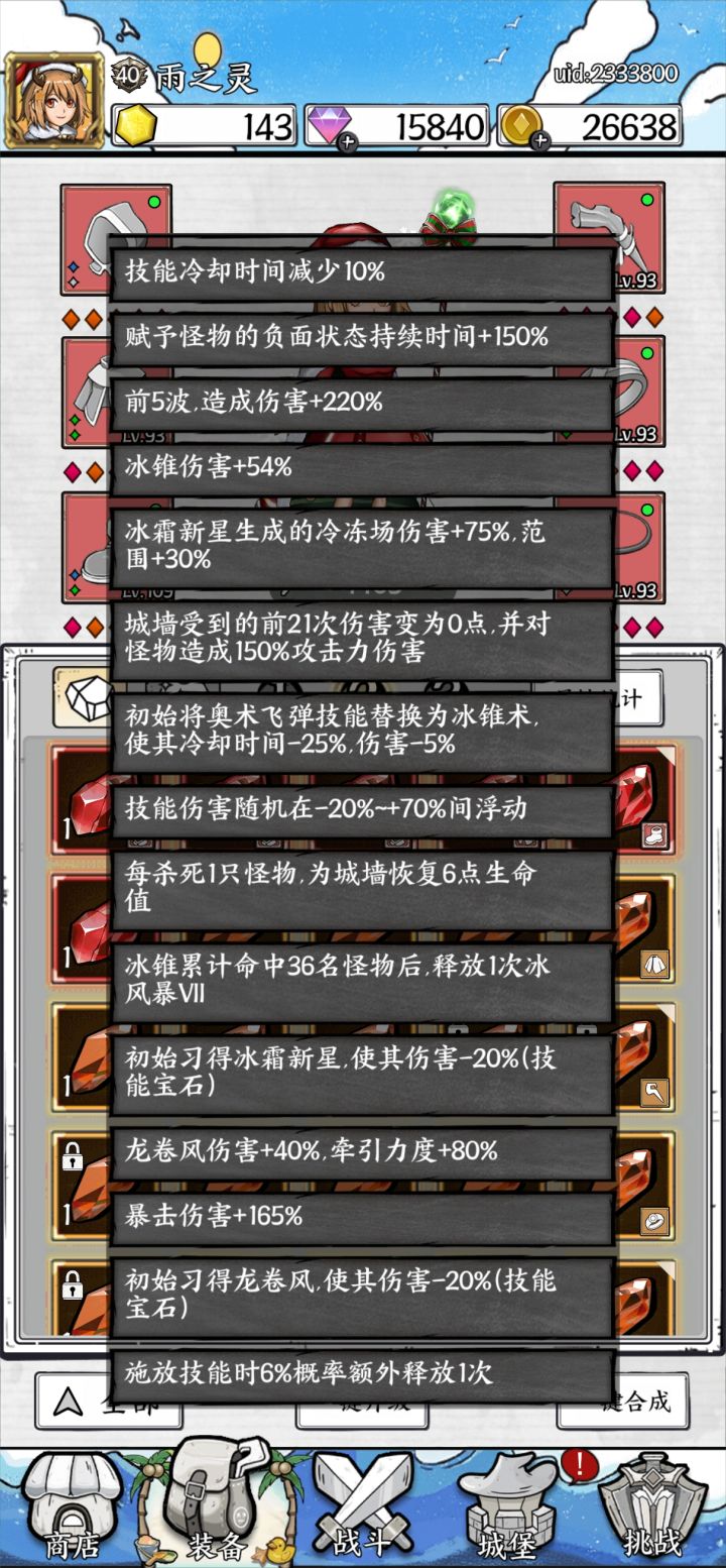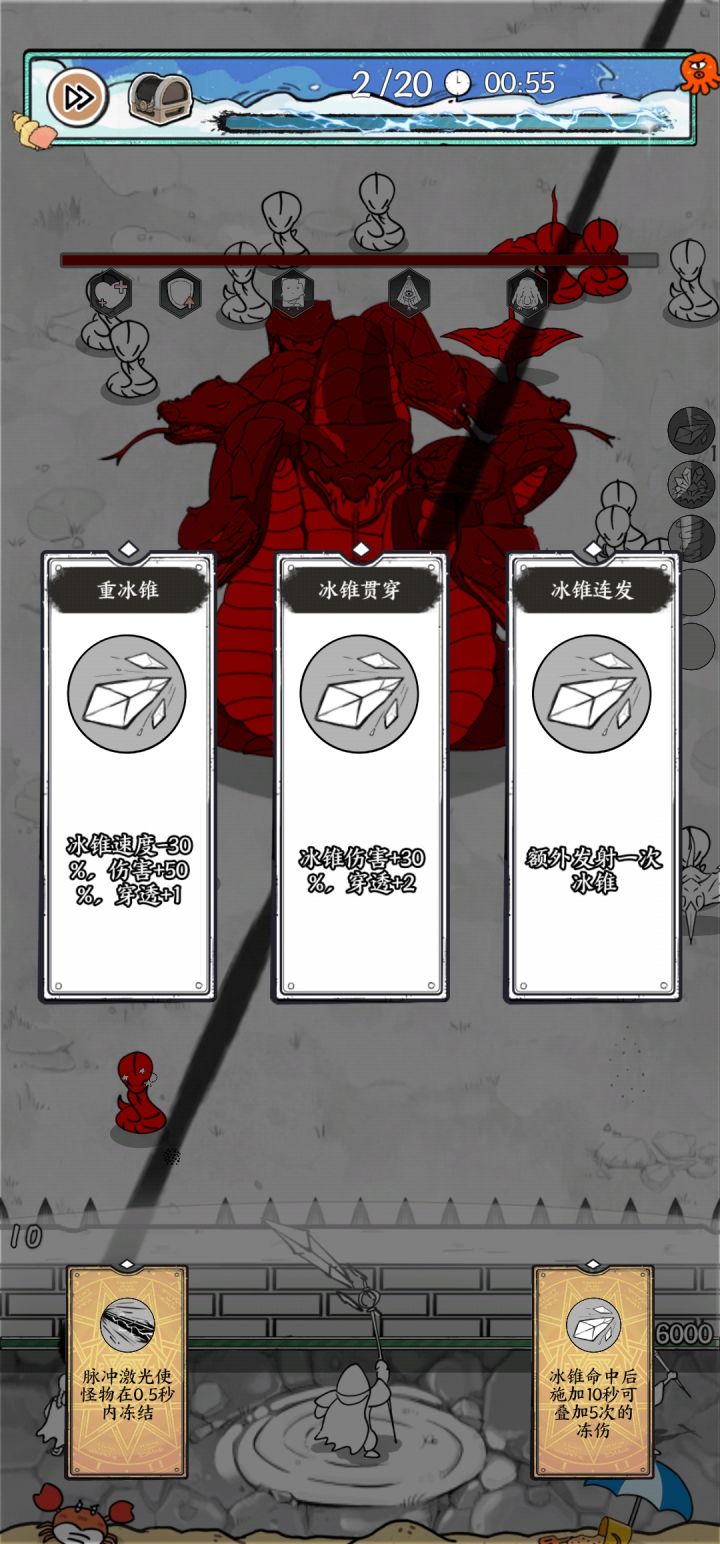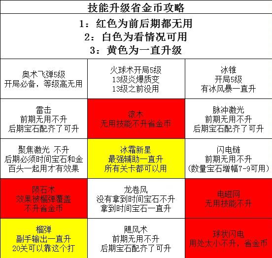如有错误欢迎大家指正图一为技能介绍图二为局外升级简介图三为局内升级顺序开局:武器位置,奥术弹1-19关(可用冰锥+冰风暴替代)前期:(20-35)武器:冰锥/雷击(搭配核心宝石)项链:龙卷风(贯穿游戏,搭配时间宝石)戒指:榴弹(前期必备)中期:(30-55关)武器:雷击/飓风(红色及以上雷击链,没有就飓风)项链:龙卷风(贯穿游戏,搭配时间宝石)戒指:榴弹/冰霜新星后期:(