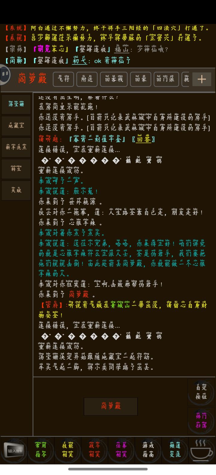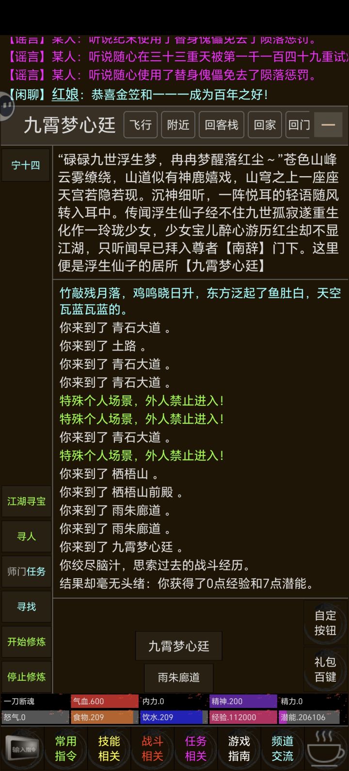 7月11号,在家闲着无聊,准备在tap上找点好玩的游戏,梦江湖刚好出现在首页上,看着评分很高,想必质量不会差,而且武侠类的文字游戏,没有玩过,想尝试一下新类型的游戏,就打开了云游戏,进入游戏界面,我就一脸懵,游戏界面功能太多了,根本不知道操作,随便选择一下,然后人物出生了,最后无从下手就加了一下官群,刚进群就用一群大佬在欢迎,感觉挺受宠若惊的,问什么问题群里的大佬们都会热情解答,当时没看攻略开局都