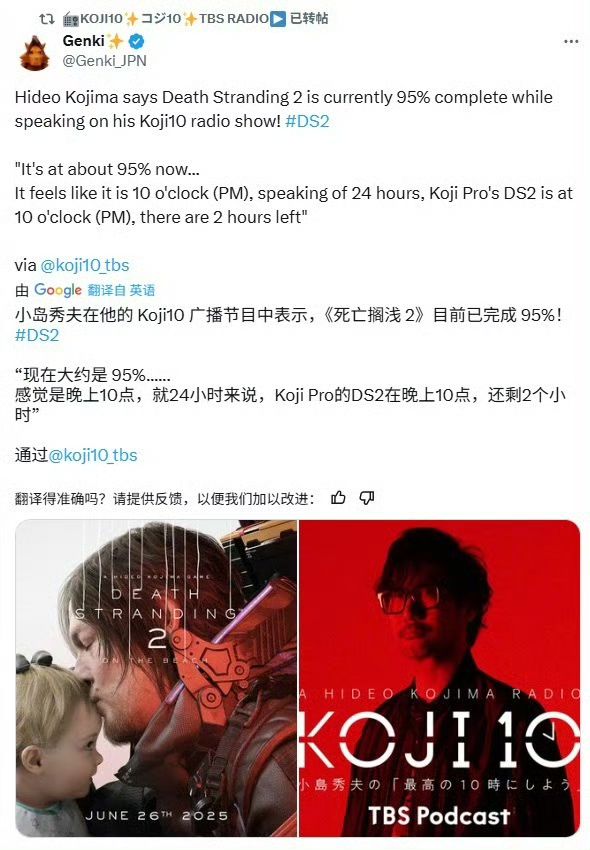 在电台节目「KOJI10」中,小岛秀夫透露《死亡搁浅2》的开发进度已经达到了95%。“就像是晚上10点,过完一天需要24个小时,那么现在《死亡搁浅2》的进度已经是晚上10点了,还剩2个小时。” #主机单机 #今天游戏圈发生了啥 #死亡搁浅2冥滩 #死亡搁浅