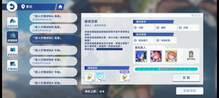 重点!!!大家一定要先拉9个角色到70级完成每日高级委托啊(优先迷境探索,需要4先锋2均衡3辅助,额外资源需要对应的角色标签) 后续拉角色70级完成自己想要的素材委托,每日委托材料源源不绝,大家可以慢慢磨不要急 这个时候可以把体力投入纹章的穿透刷取(90级的纹章没有穿透),着急的也可以把体力用在自己想用的地方。#每日委托 #资源