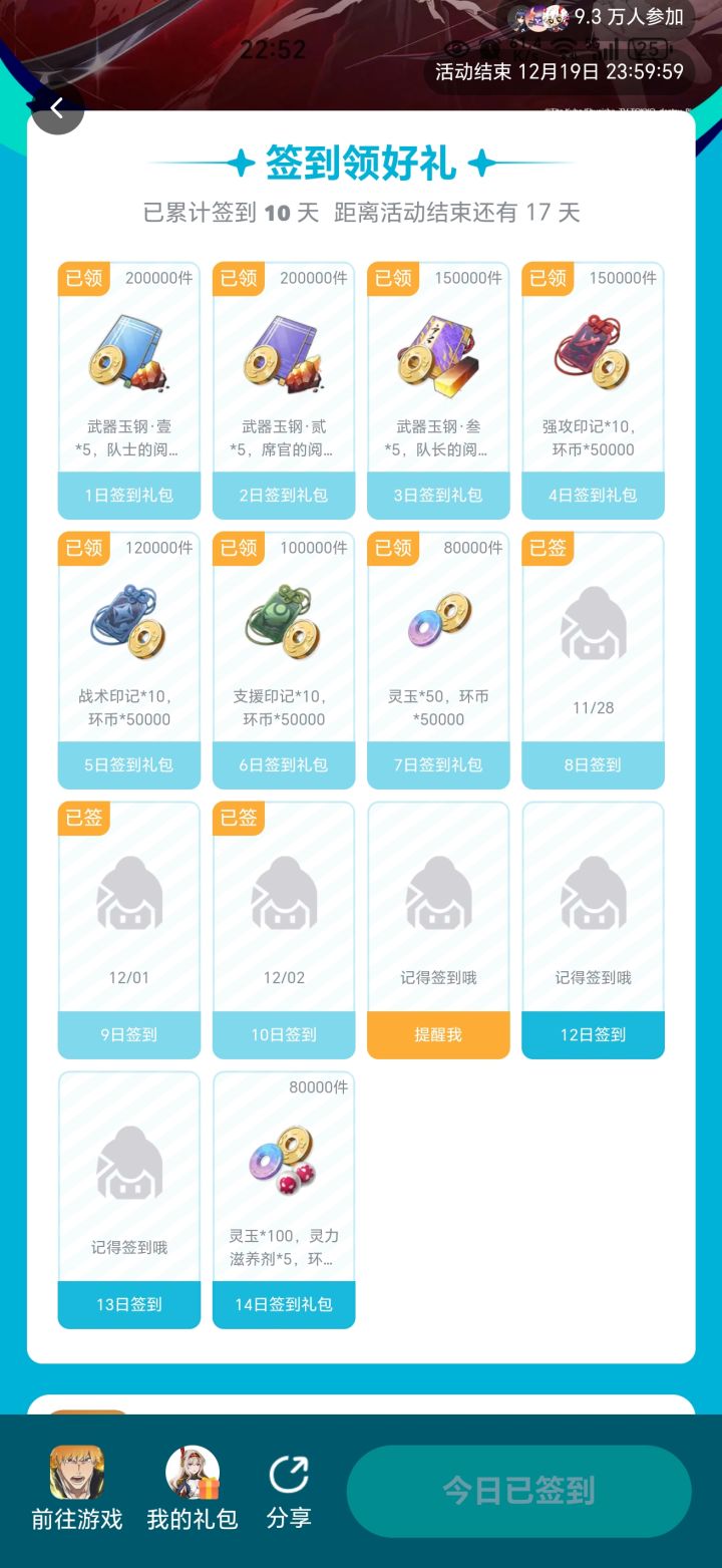 嗨!大家~你的锤来啦!8月签到以及月度惊喜更新啦,速速来领取啦!【活动时间】即日起至8月31日23:59【参与方式】•点击 即可跳转参与•签到获得礼包码后,「进入游戏点击头像-选择兑换码-输入礼包码」•签到满15天共领寻宝图章*15、刮刮券*50、橙色随机武器碎片*40、橙色任选武器碎片*20➤签到福利加码放送•参与方式:在本帖评论区评论分享签到截图即可成功参与;•活动奖#每日签到