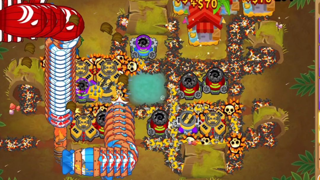 随便放就行了,不知道怎么能死,一个203大炮就能守到27,2个能39,直接放选个能清迷彩的就行,比如冰猴320,潜艇420,随意#气球塔防创作狂欢派对