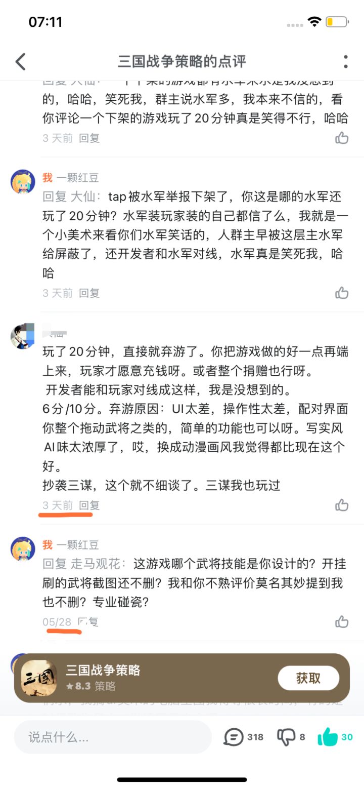 人群主做其他项目十几天没怎么更新游戏,水军也跟着消停十几天。这周一人群主Q群刚活跃更新游戏,水军马上就在tap带节奏,tap被下架了压根没更新,水军却刚好在游戏版本更新的时候活跃。这水军水了超过十万字了,都水出规律了。我就一slg爱好者,看人群主为爱发电,用扑克牌做的武将技能图片没发看,所以帮忙搞了一些图,所以不是什么开发者,也不是人群主小号,回复评论也不是为了什么群主悬赏。老子就一直是群里的