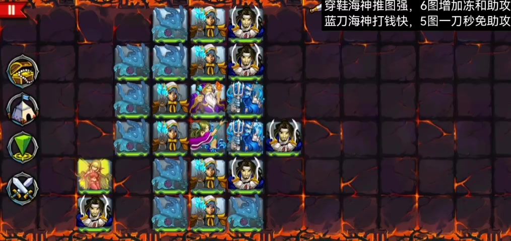 穿鞋海神推图强,增加行动,增加冻和助攻 蓝刀海神打钱快,一刀秒免助攻5图怪,打的更快 点我头像可以看到更多难关 火,水法,精弓,鬼弓,捉有远攻被动的,属性随意(前期过渡兵,边推图边捉替换)(电没远攻,难玩点) 武士,捉速度快的,攻高更好,被动随意 过关常用套路,看以下贴, 新手教程,新手攻略,阵容选择 https://www.taptap.cn/moment/643118223943797284?