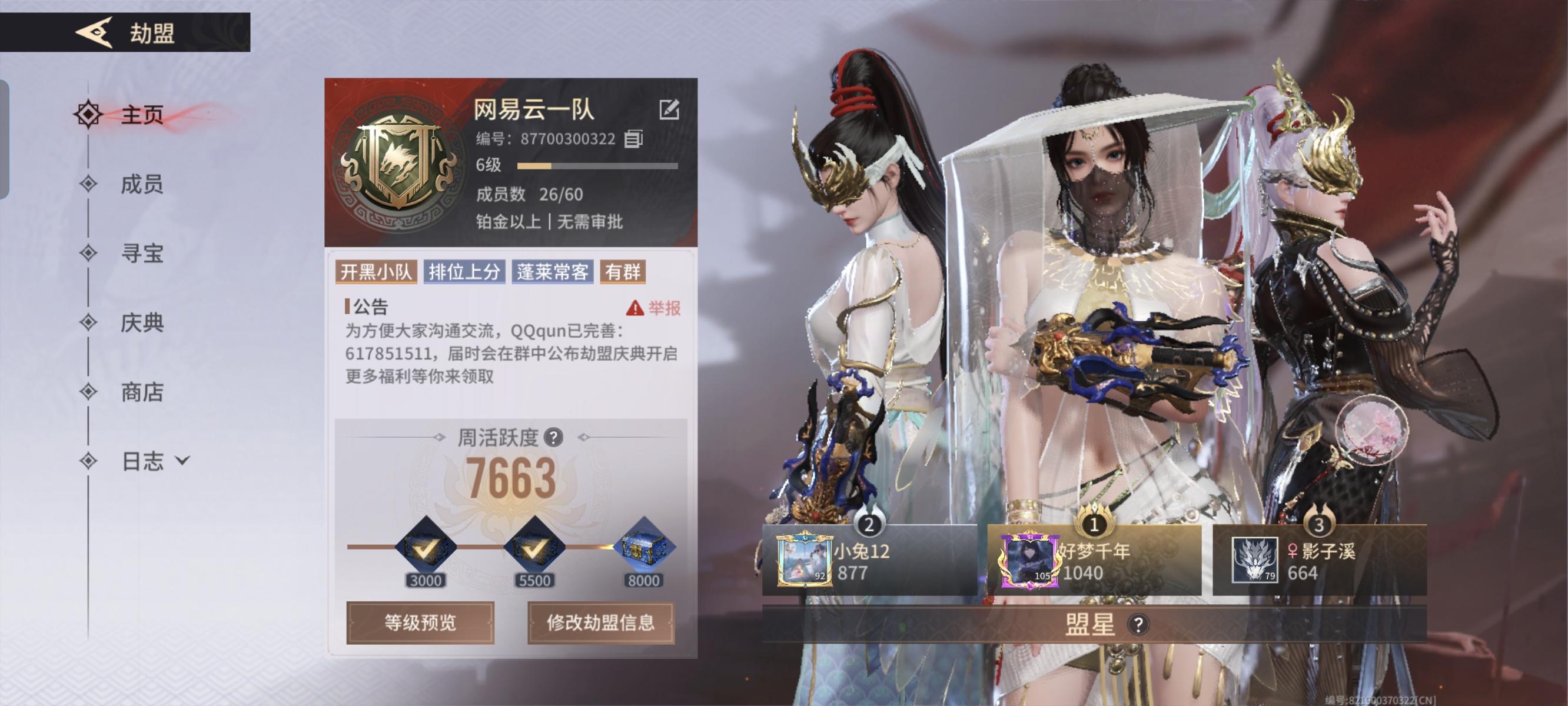 满级劫盟,诚邀活跃度高,有麦好交流的劫友加入我们。劫盟都是帅哥美女,有意向可先加V群,一起约排位夺宝,组队诛神#永劫无间手游 #永劫无间劫盟