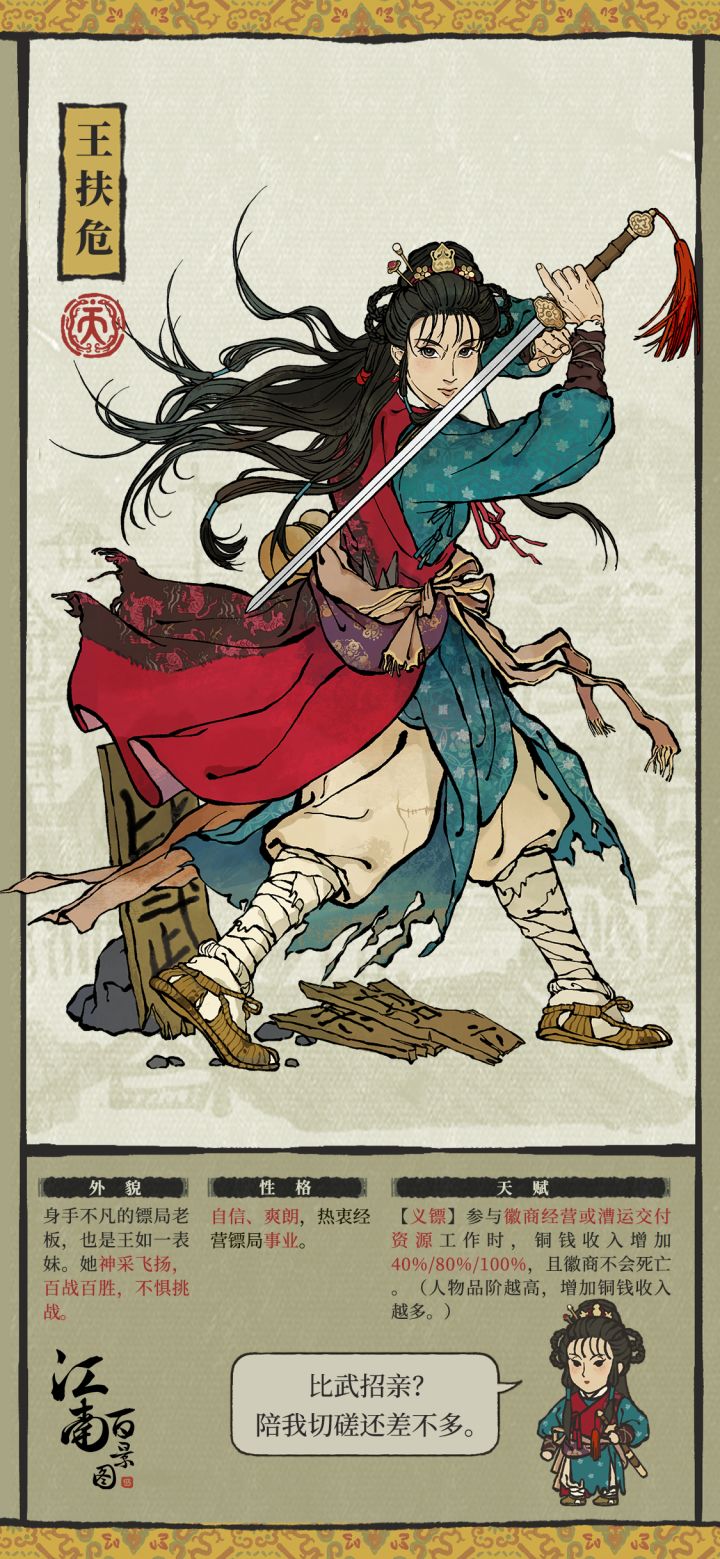 达摩剑在手里挽出个漂亮的剑花,木制招牌便断成了两截。刻着「比武」那截的,靠着石头勉强立着,而「招亲」那截则被挑在了半空。王扶危冷哼一声,手顺势一劈,招亲残牌再次裂成两半,狠狠砸在地上,溅起泥土与尘埃。「比武招亲?陪我切磋还差不多。」她语气平和,却充满威严。擂台下蠢蠢欲动的人群一下子安静下来,纷纷收起那攀附镖局的心思,再也不敢登台。王扶危朝饮茶的王老爹摊摊手,好像在说,无人挑战,她也没办法。王